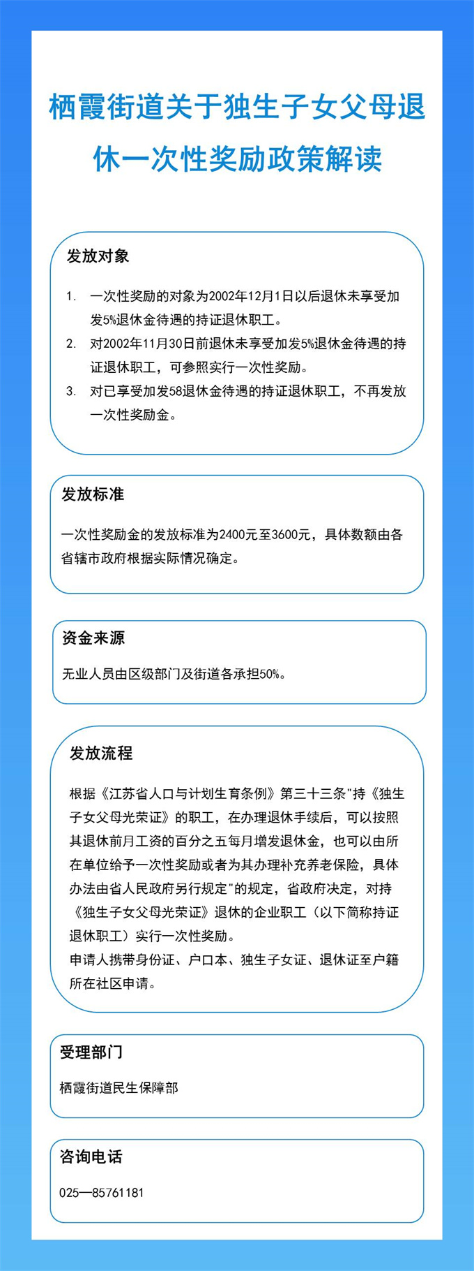 【圖解】棲霞街道獨生子女父母退休一次性獎勵政策解讀
