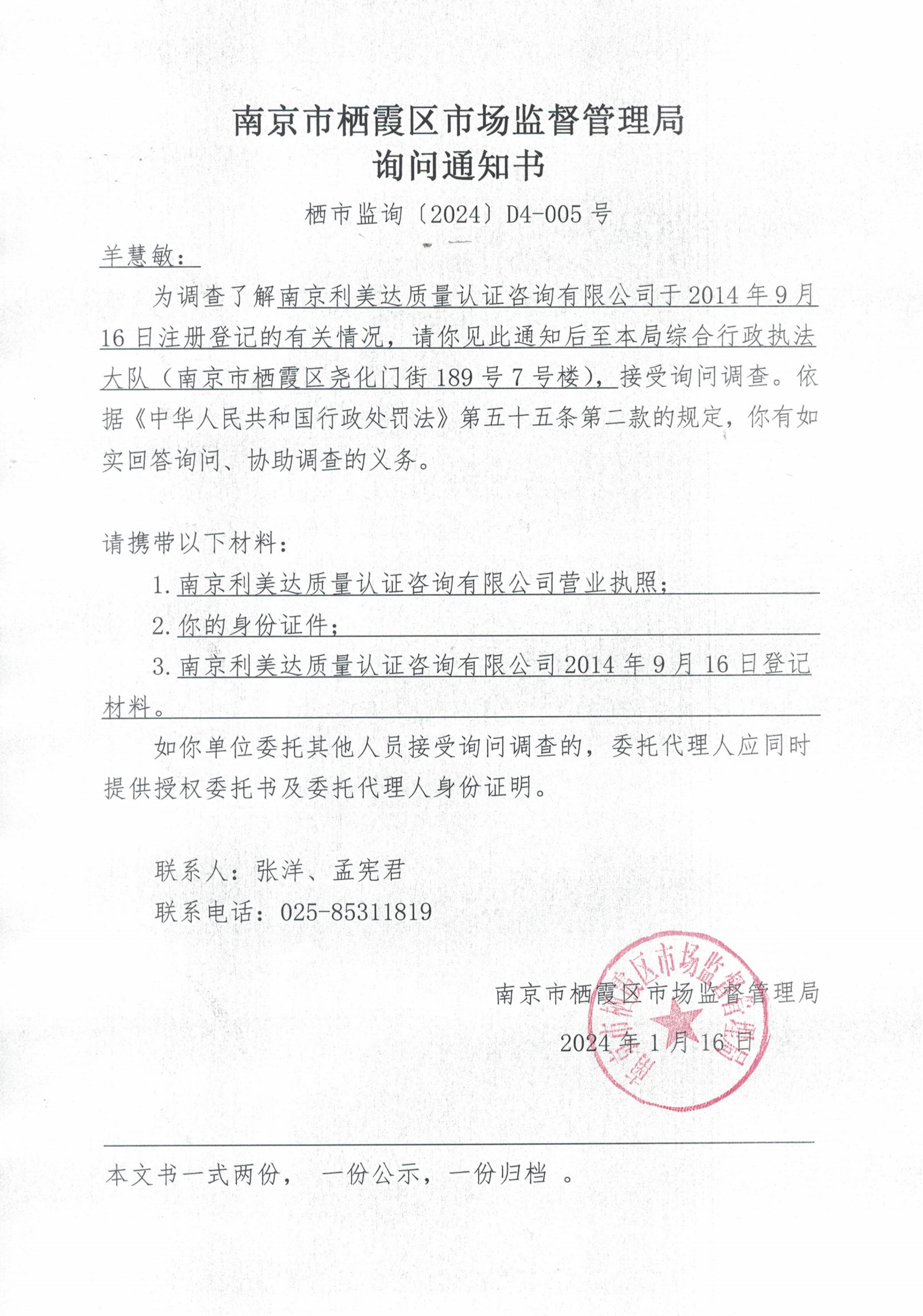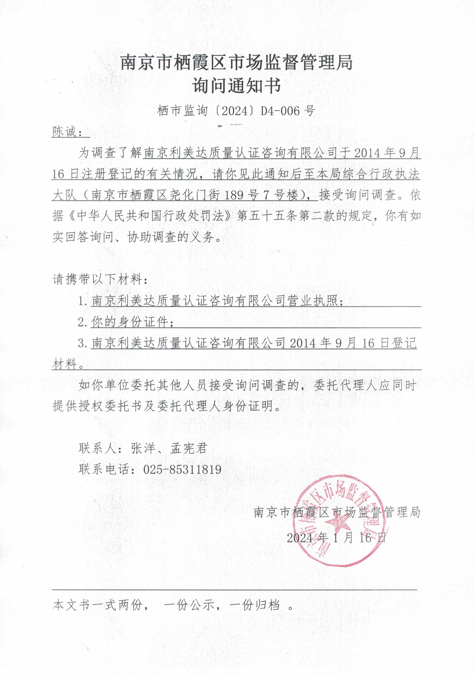 信息名稱:    南京市棲霞區市場監督管理局詢問通知書