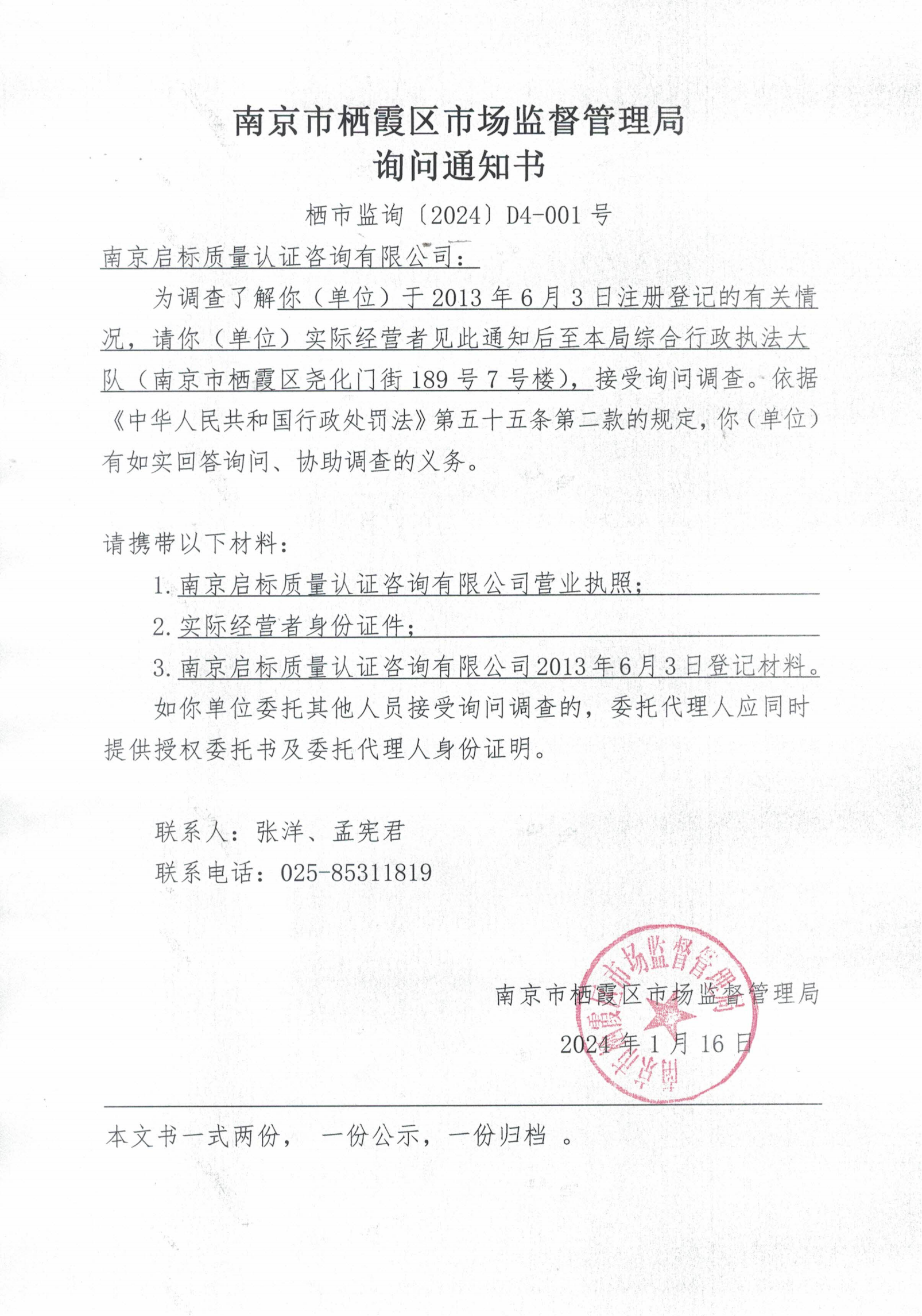 南京市棲霞區市場監督管理局詢問通知書