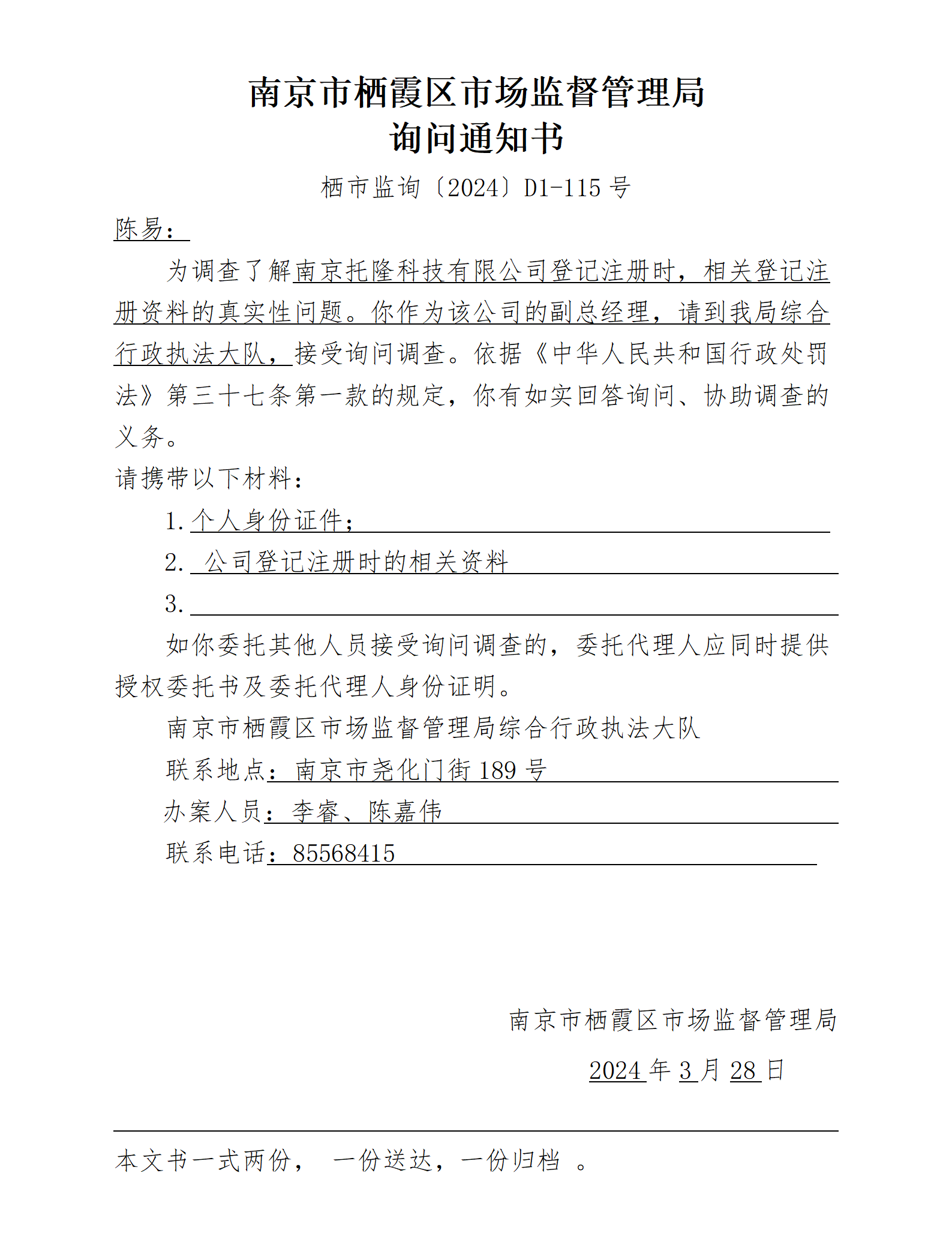 信息名稱:    南京市棲霞區市場監督管理局詢問通知書
