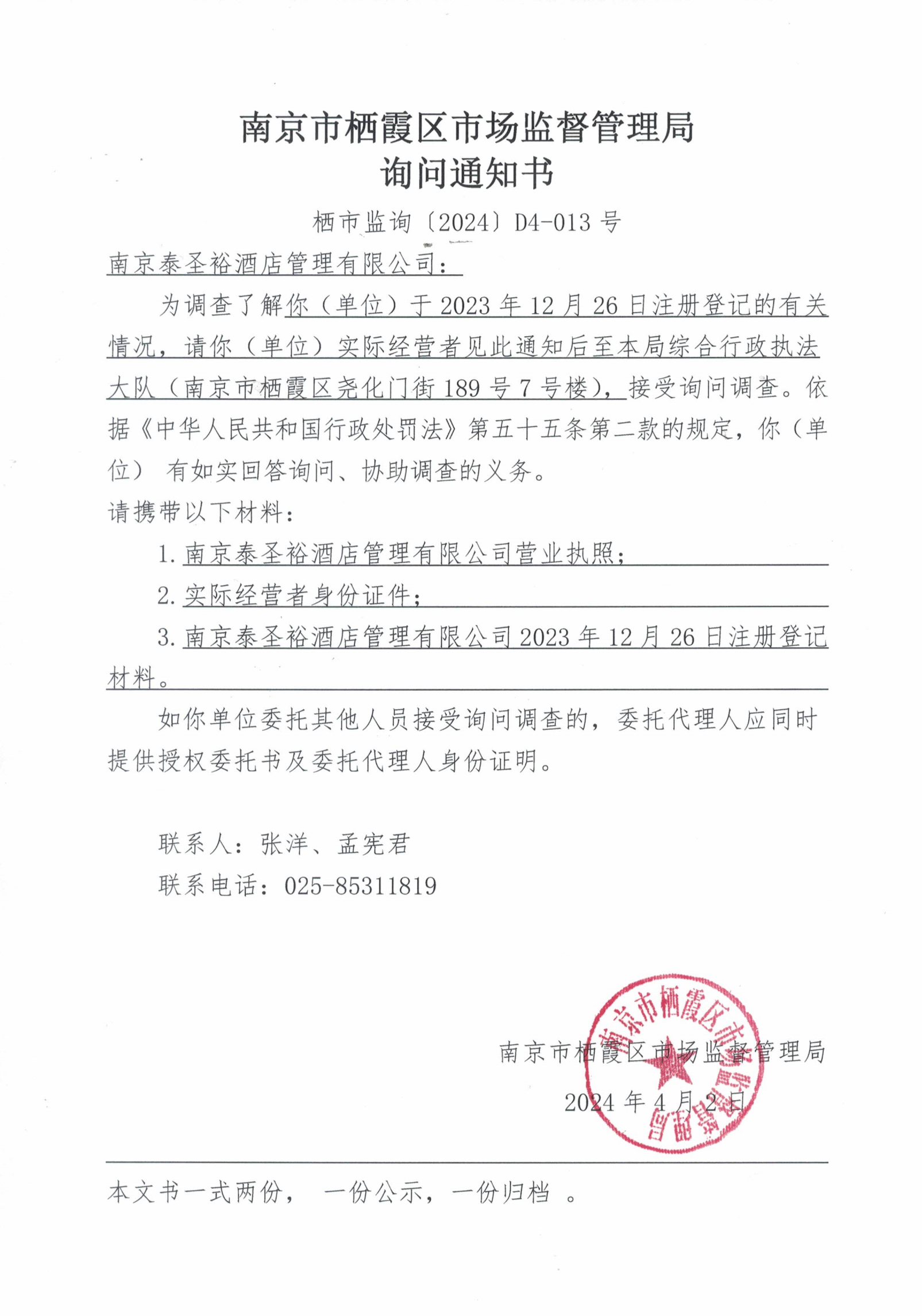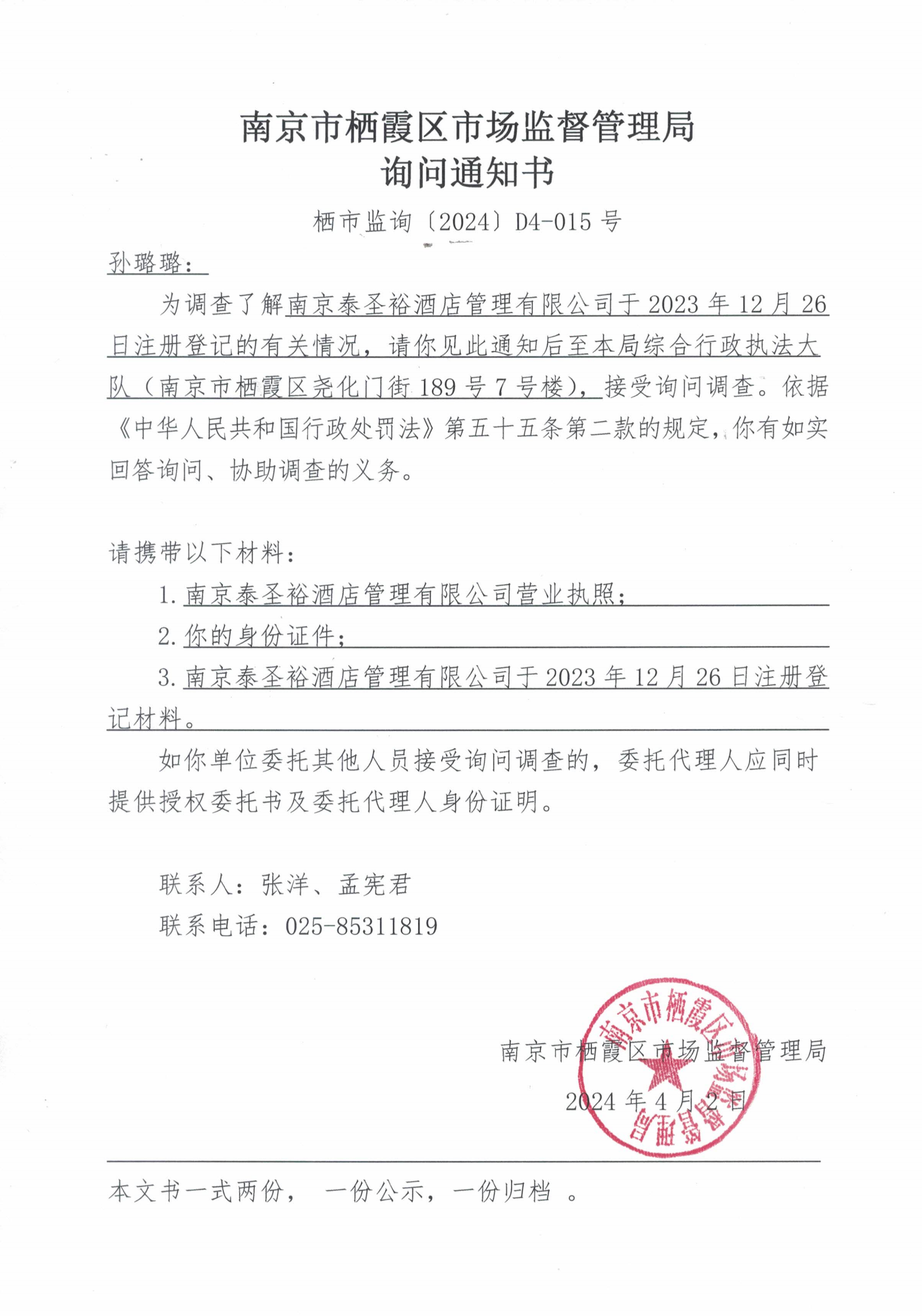 信息名稱:    南京市棲霞區(qū)市場監(jiān)督管理局詢問通知書