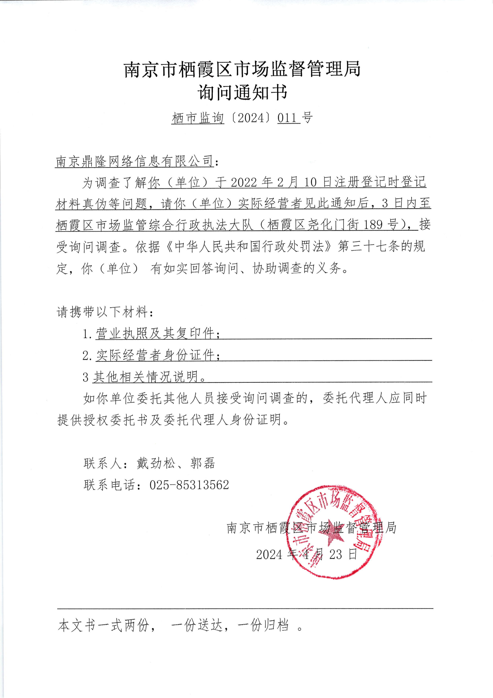 南京市棲霞區市場監督管理局詢問通知書