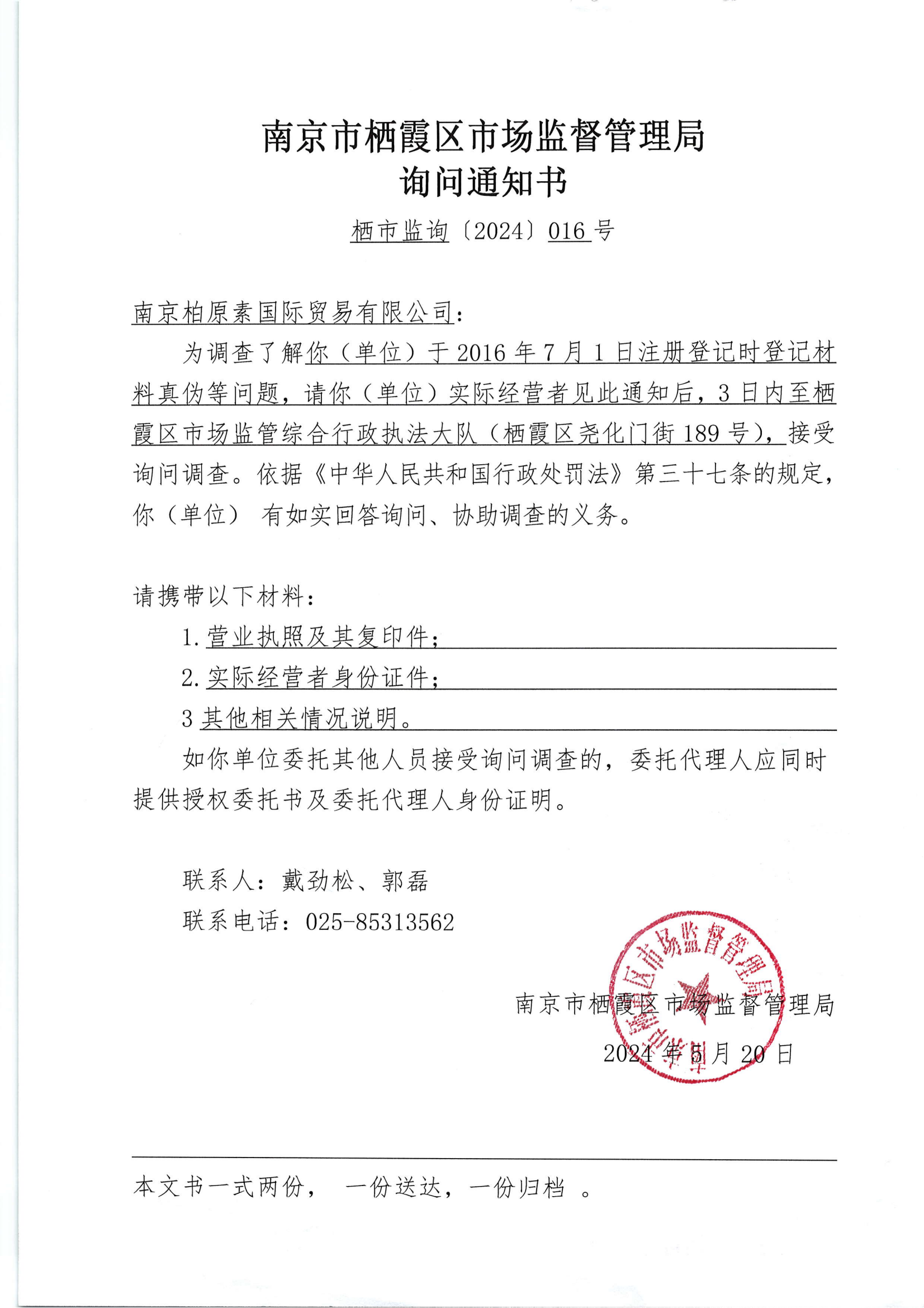 信息名稱:    南京市棲霞區市場監督管理局詢問通知書