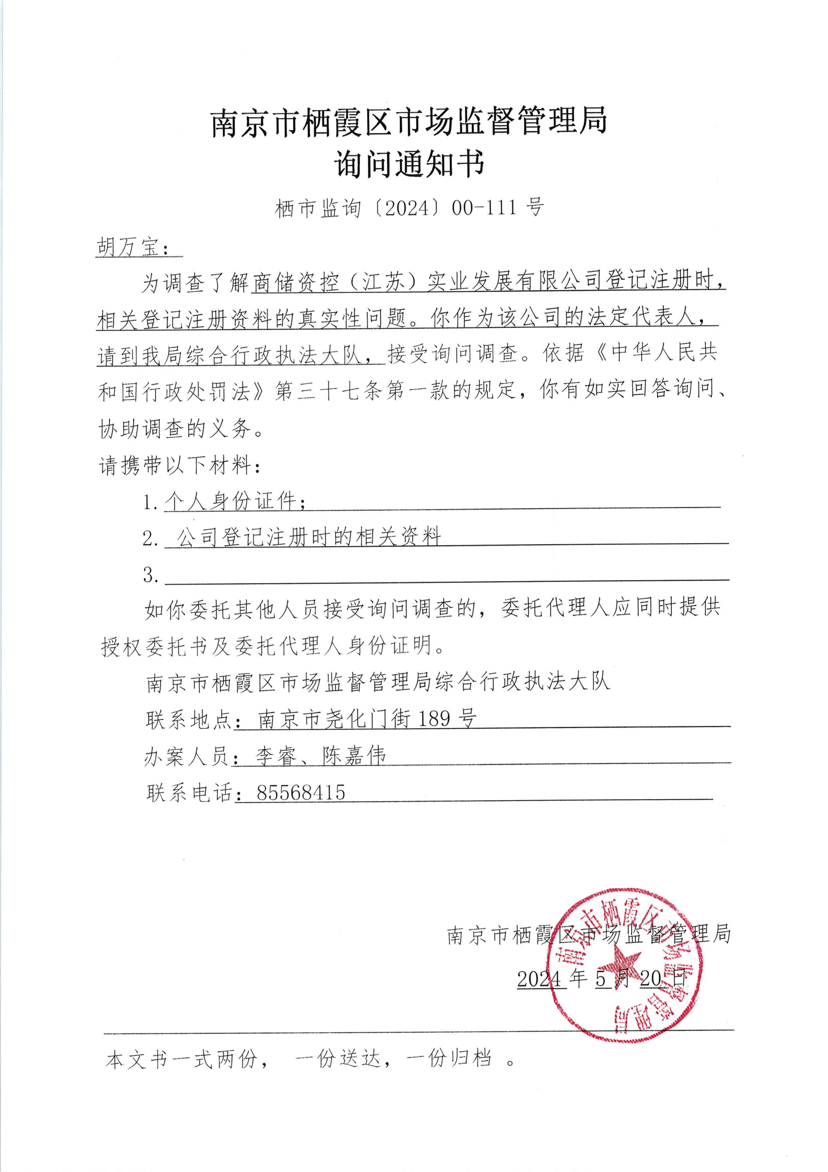 南京市棲霞區市場監督管理局詢問通知書