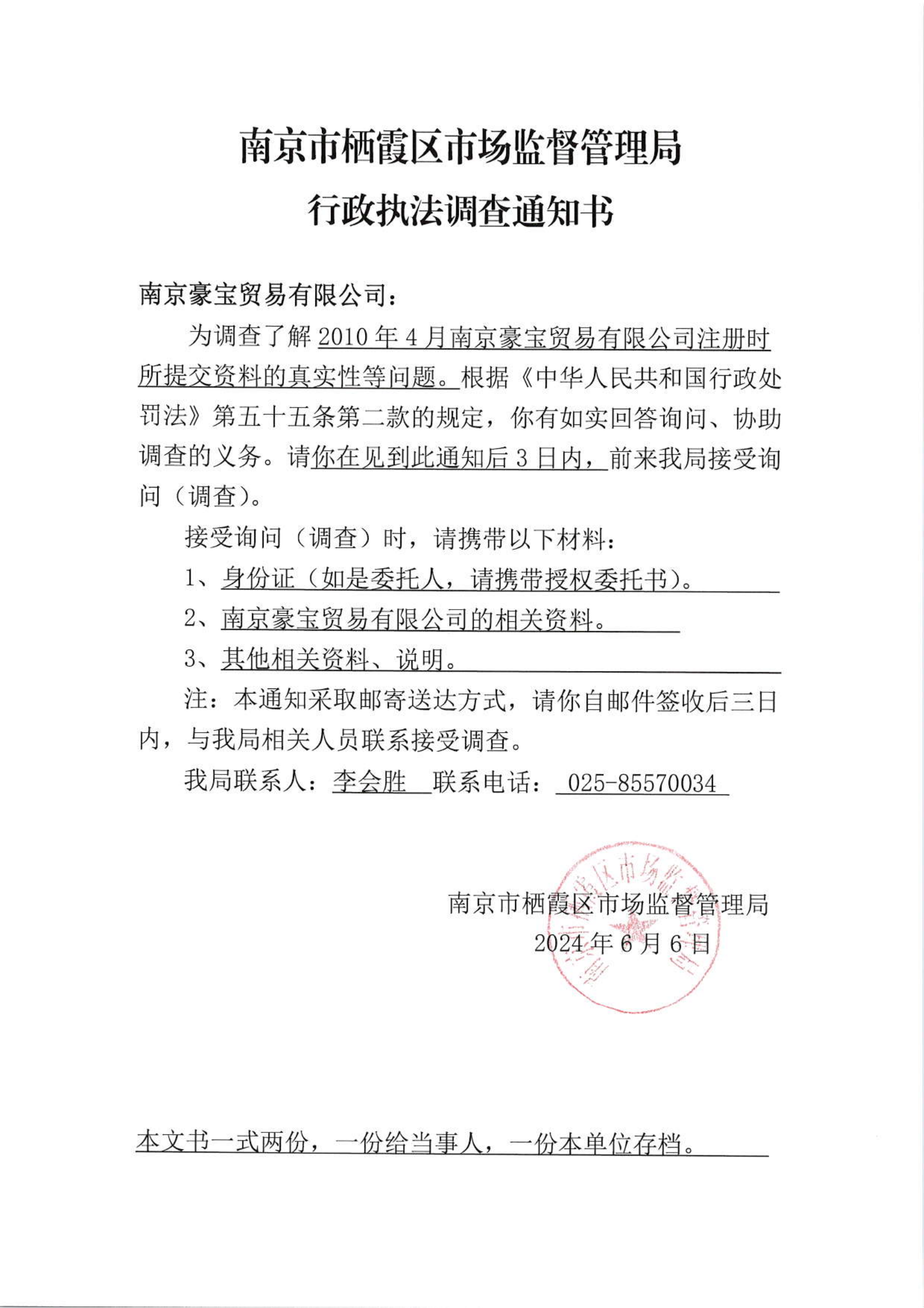 南京市棲霞區市場監督管理局行政執法調查通知書(南京豪寶貿易有限公司)