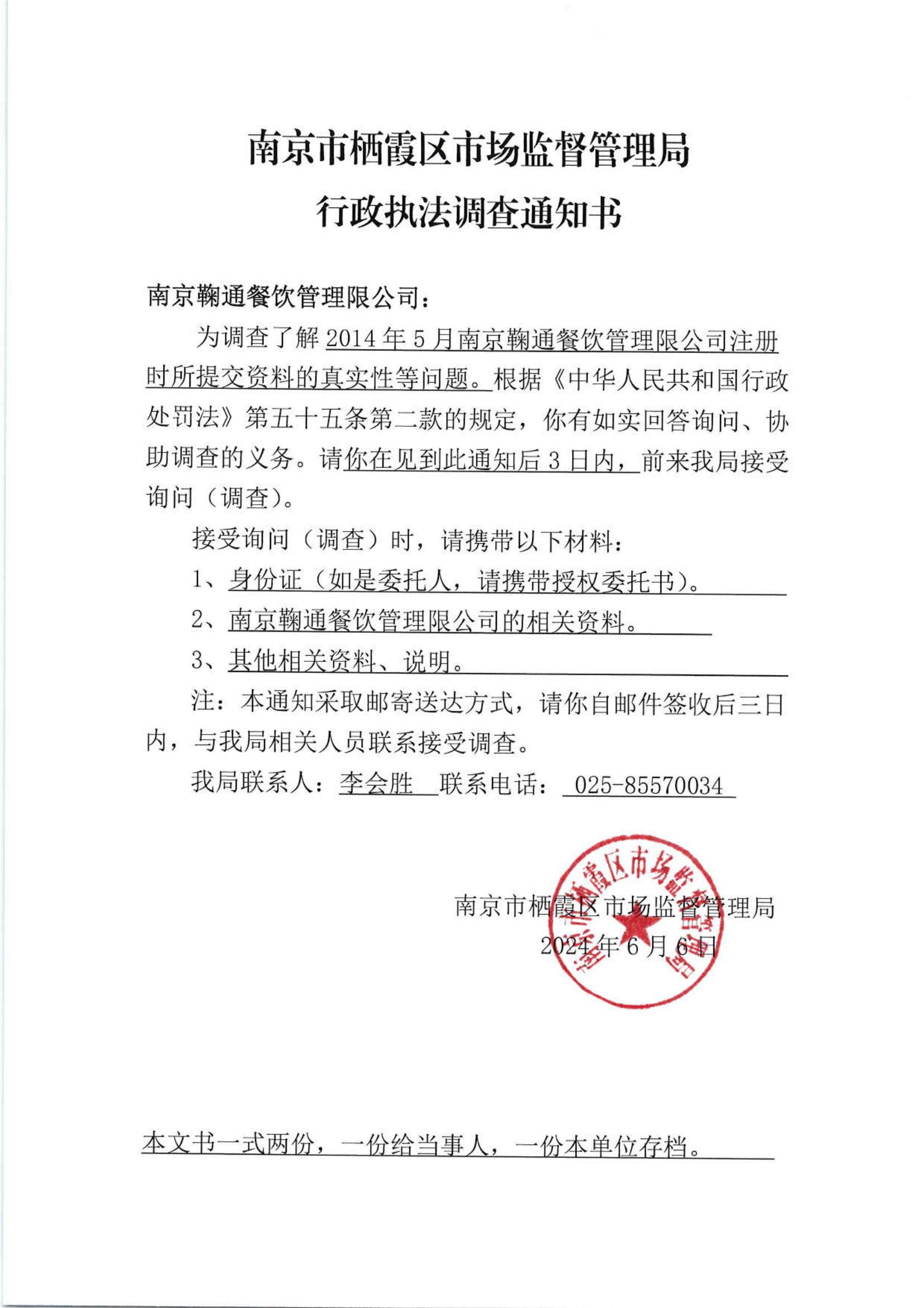 南京市棲霞區市場監督管理局行政執法調查通知書(南京鞠通餐飲管理有限公司)