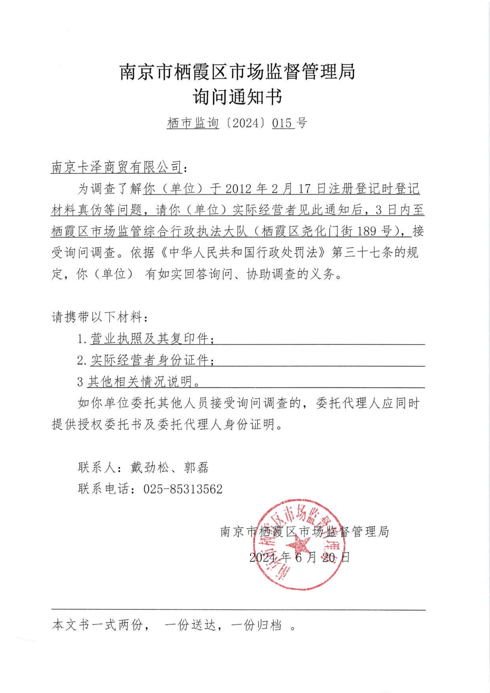 南京市棲霞區(qū)市場監(jiān)督管理局詢問通知書(南京卡澤商貿(mào)有限公司)