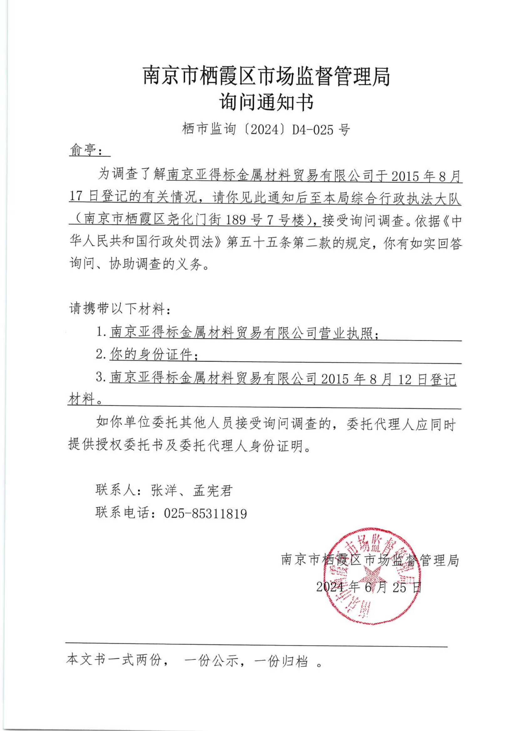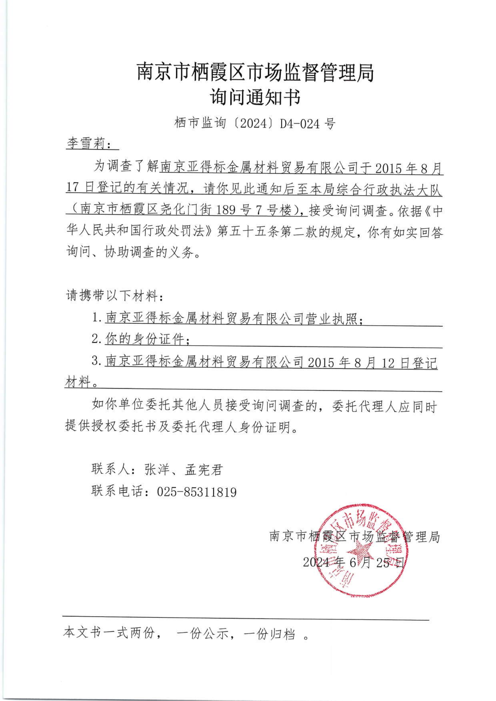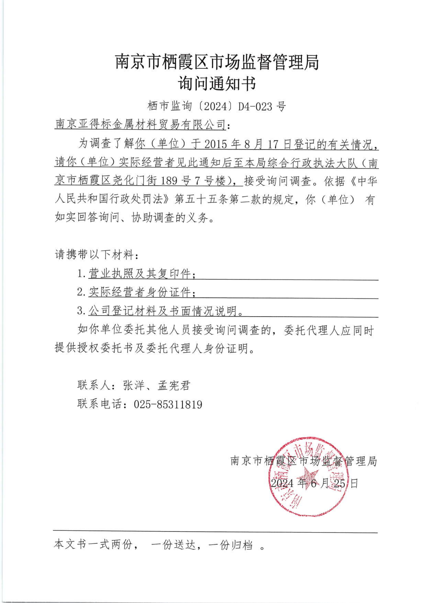 南京市棲霞區(qū)市場監(jiān)督管理局詢問通知書(南京亞得標金屬材料貿(mào)易有限公司)