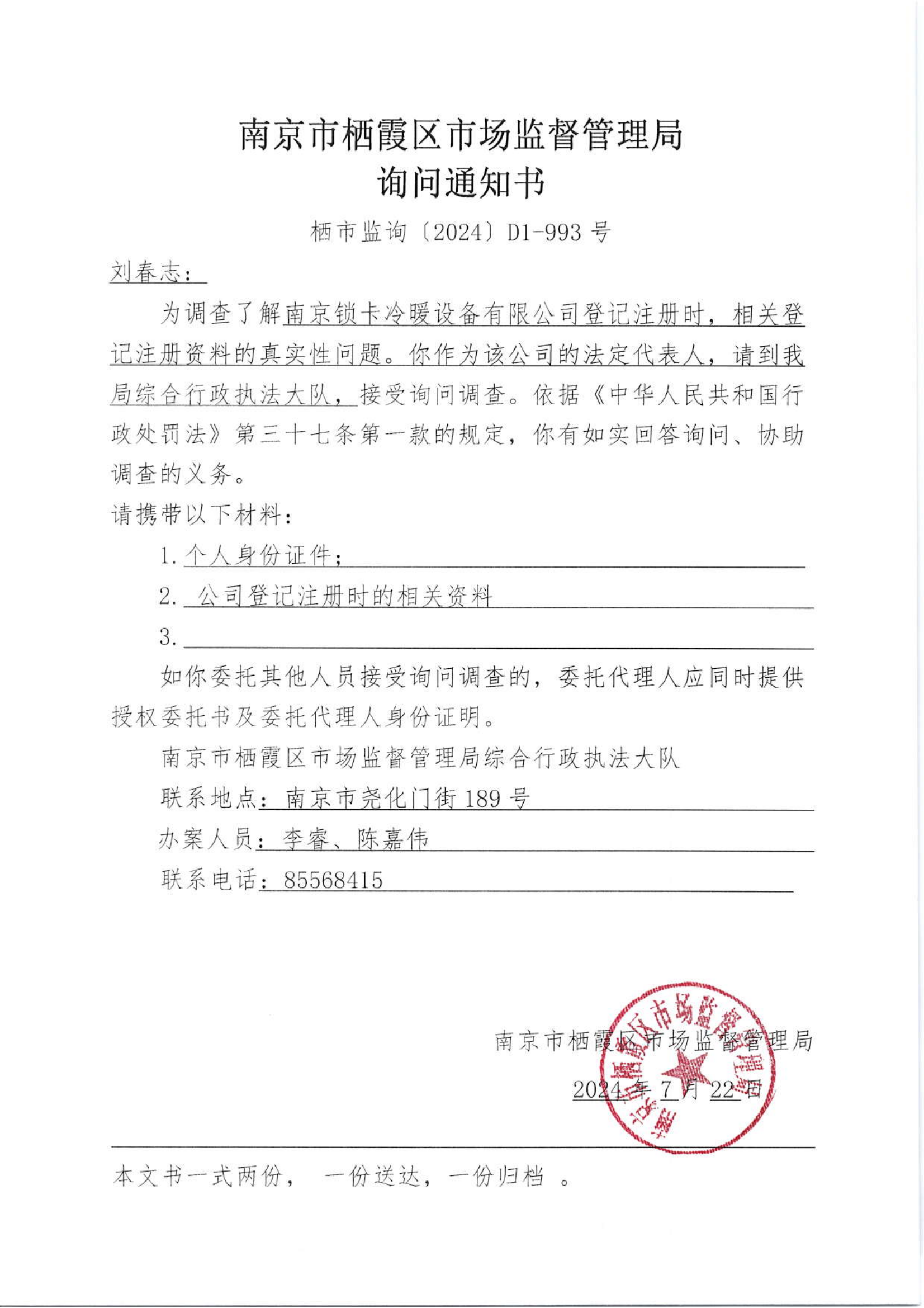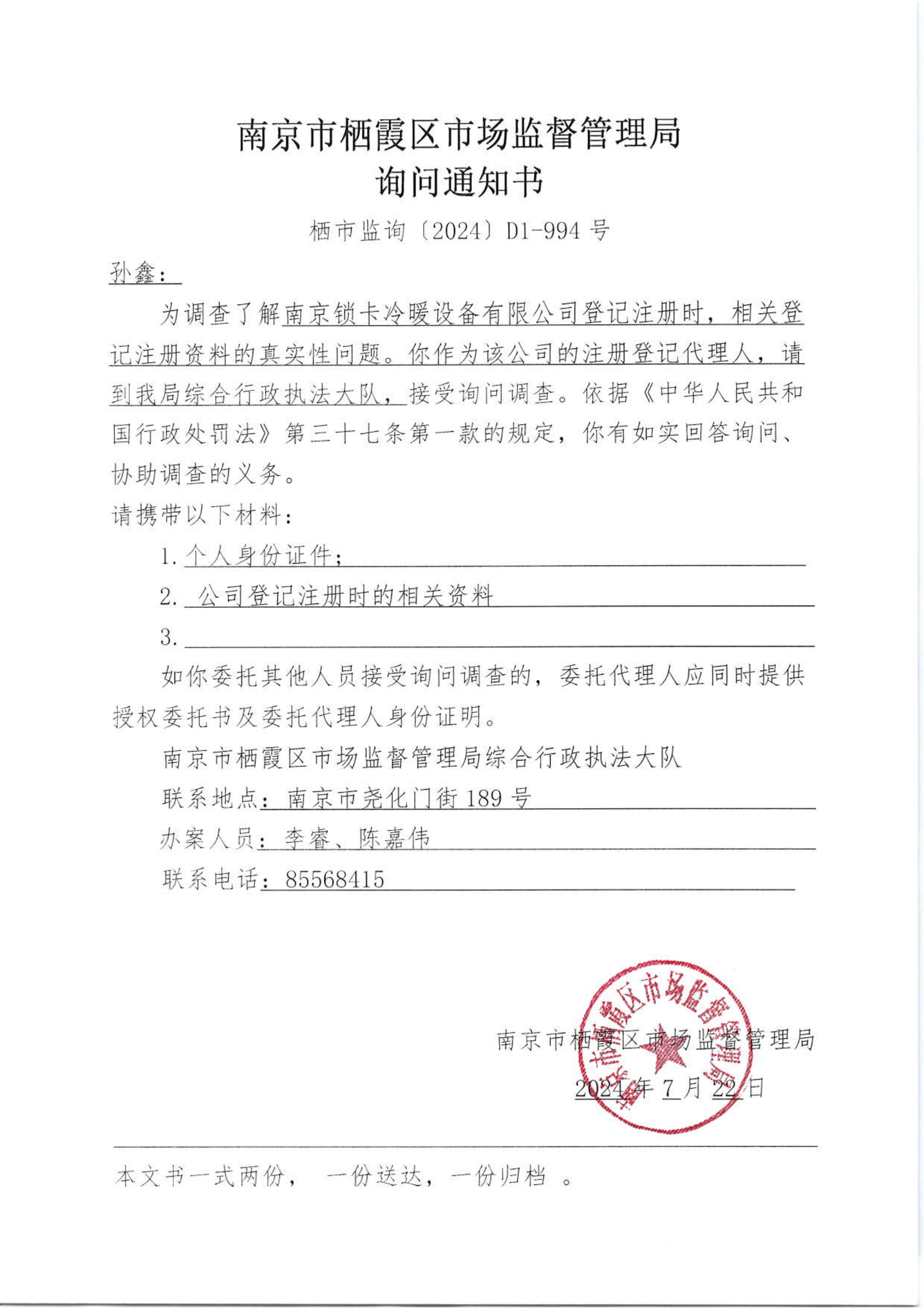 南京市棲霞區(qū)市場(chǎng)監(jiān)督管理局詢問(wèn)通知書(shū)(南京鎖卡冷暖設(shè)備有限公司 )