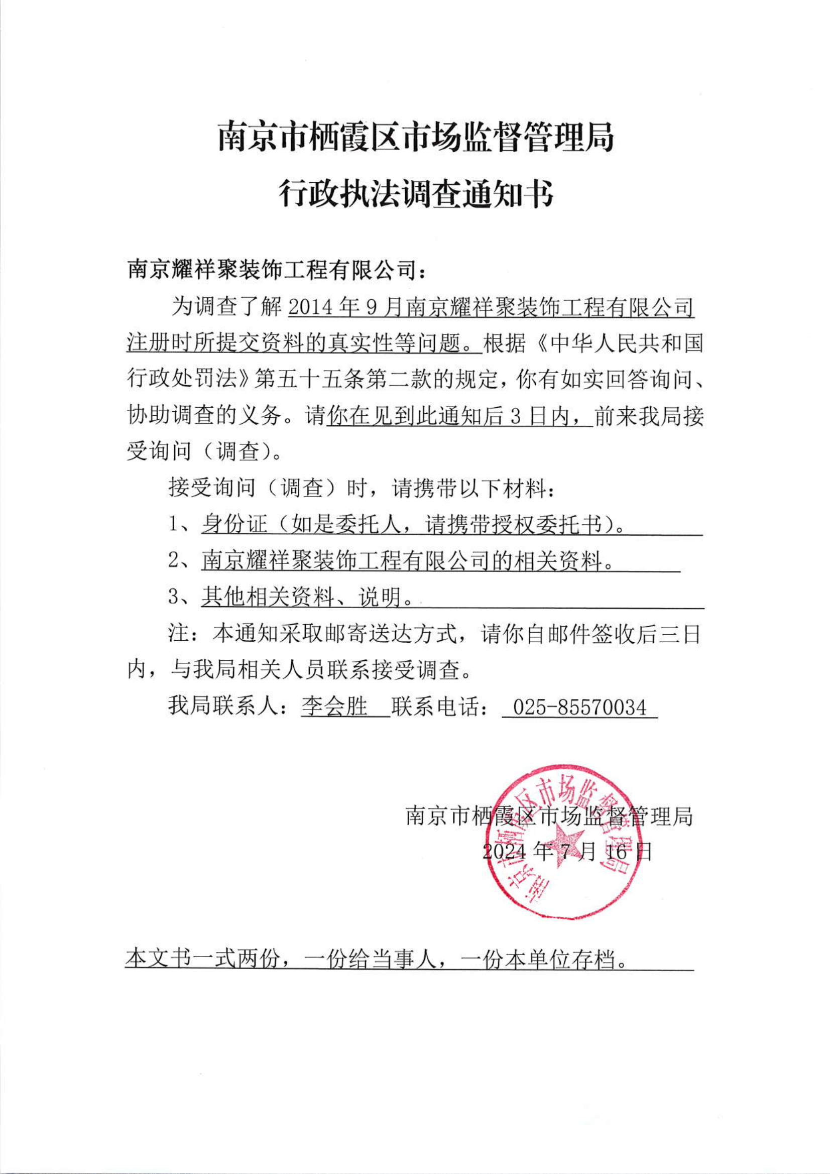 南京市棲霞區市場監督管理局行政執法調查通知書(南京耀祥聚裝飾工程有限公司)