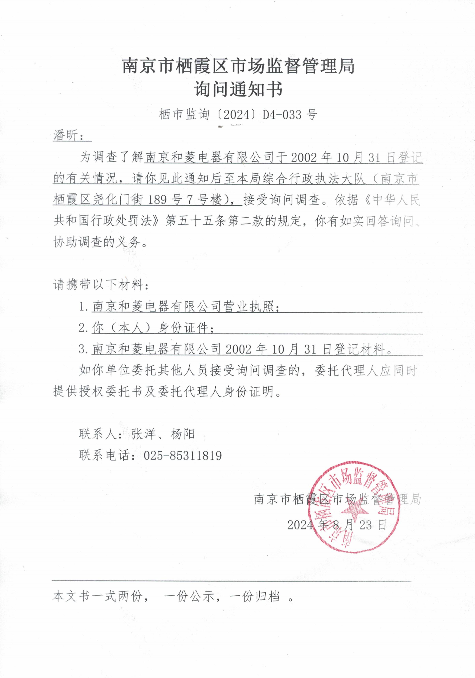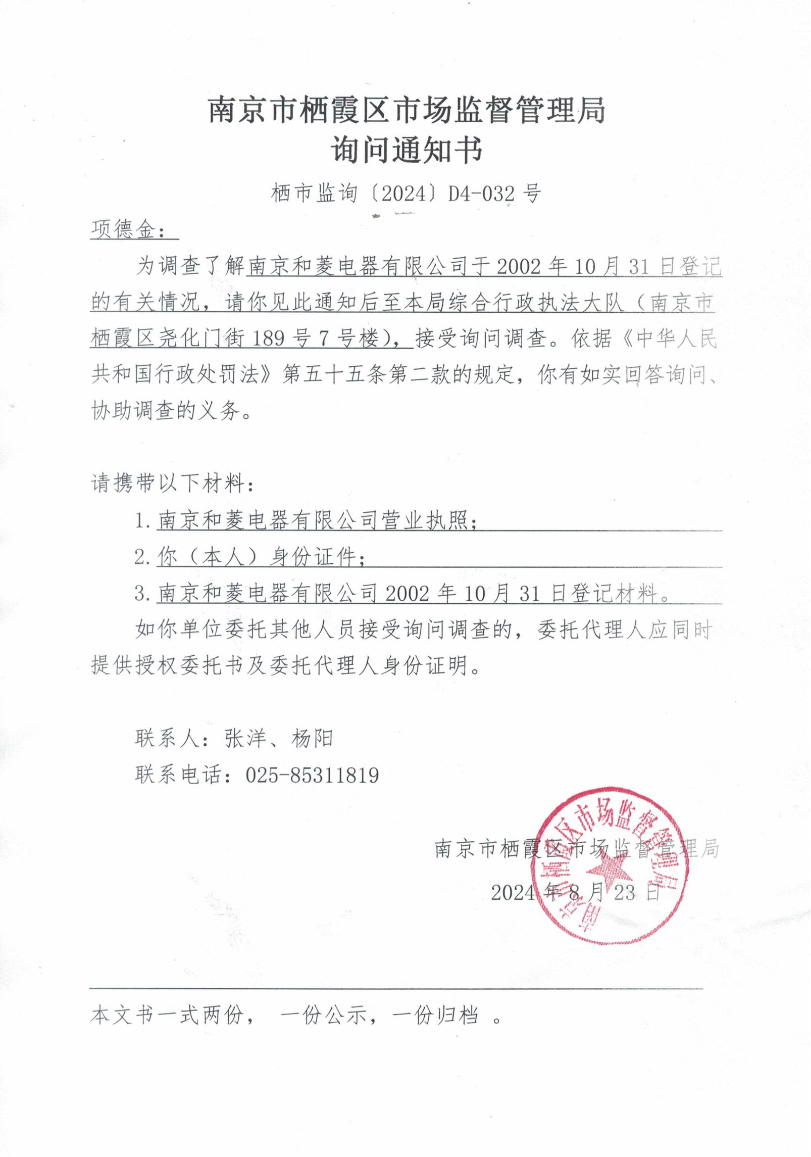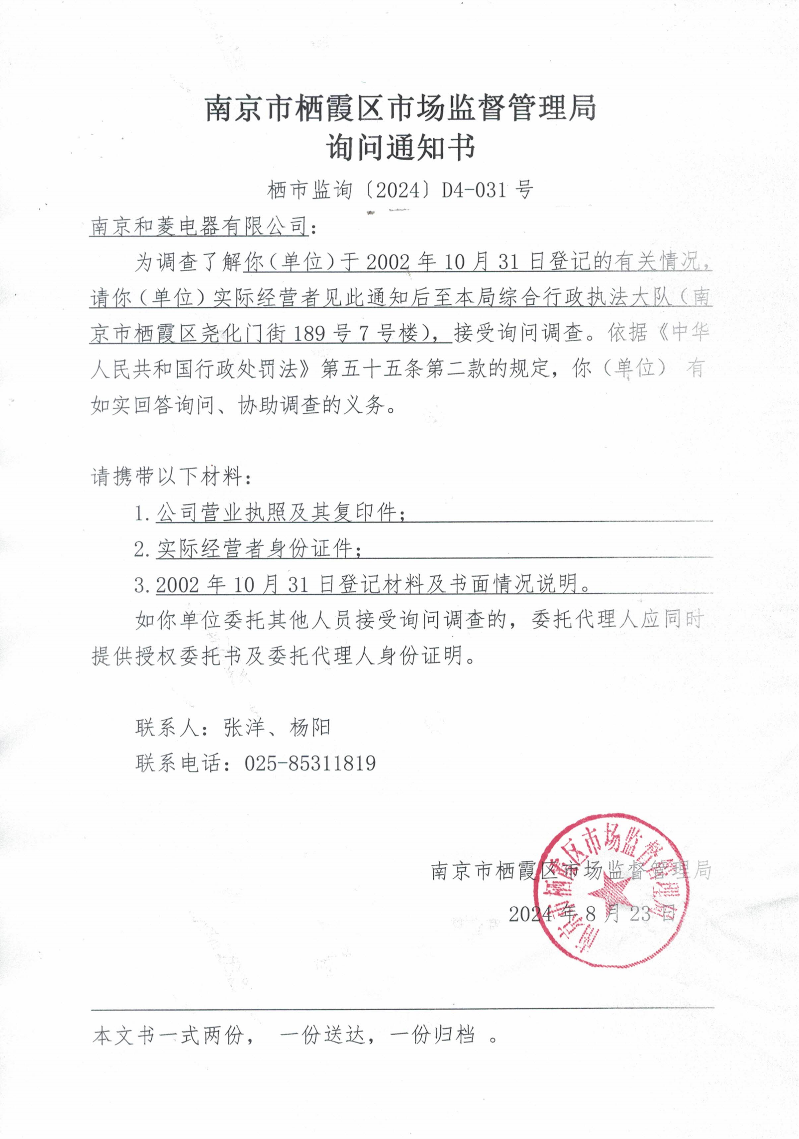 信息名稱:    詢問通知書(南京和菱電器有限公司等)