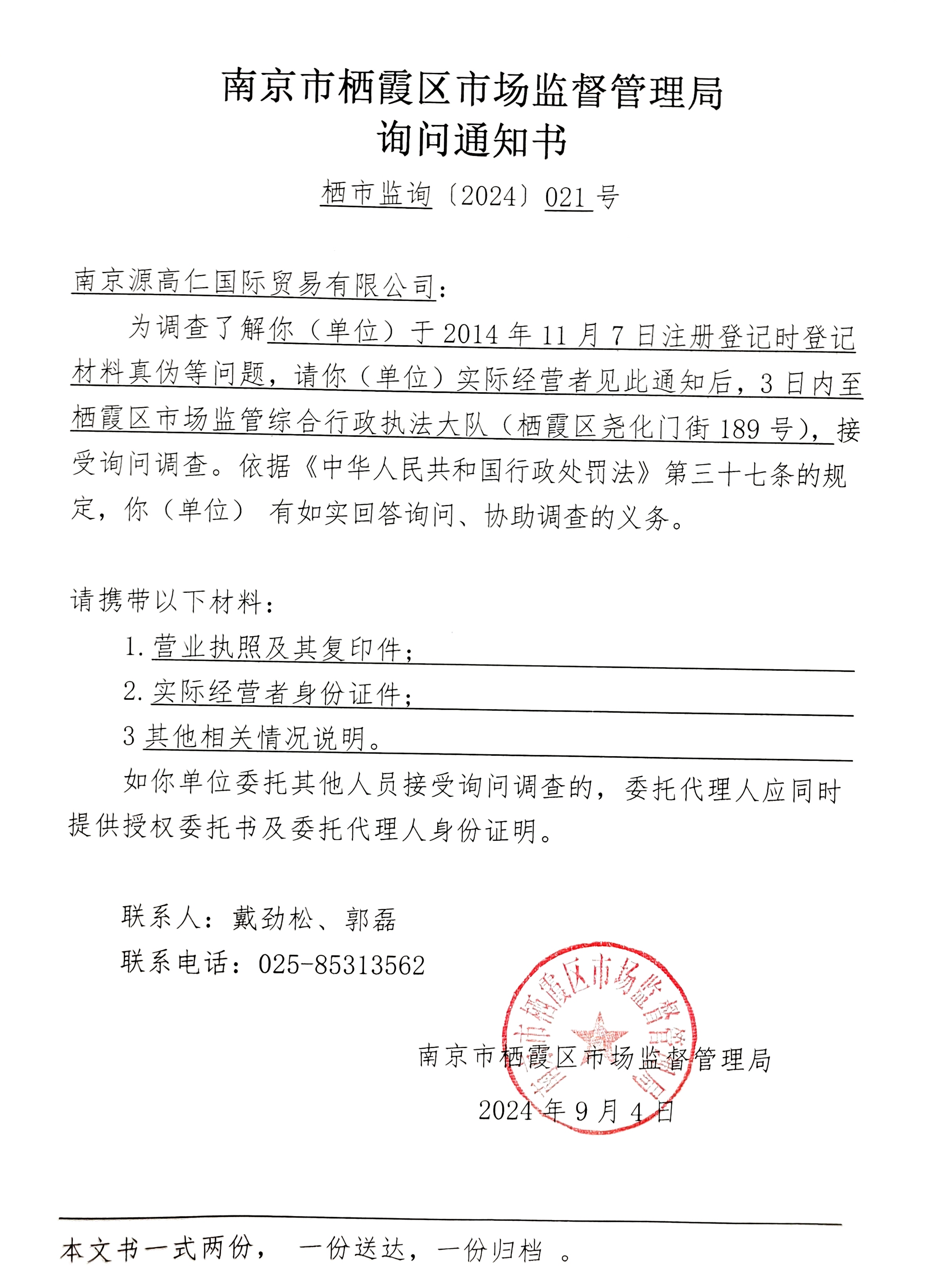 南京市棲霞區市場監督管理局詢問通知書(南京源高仁國際貿易有限公司)