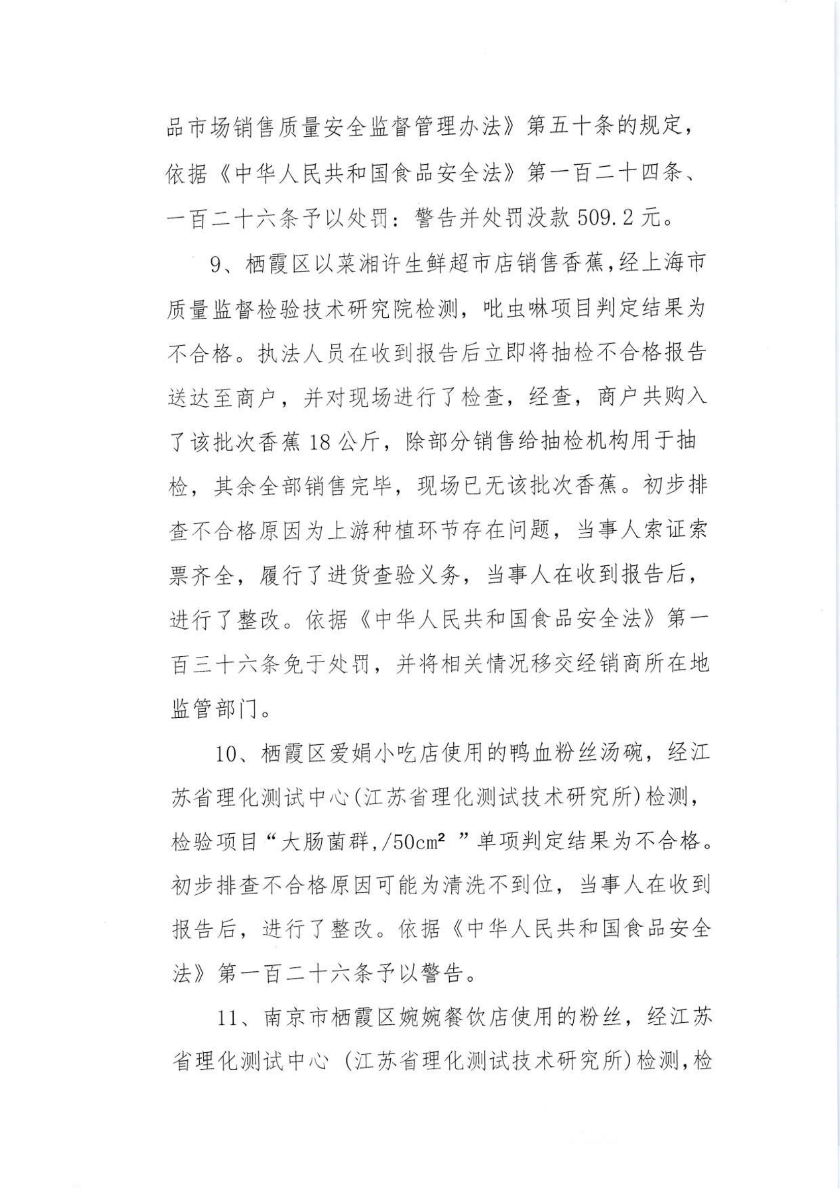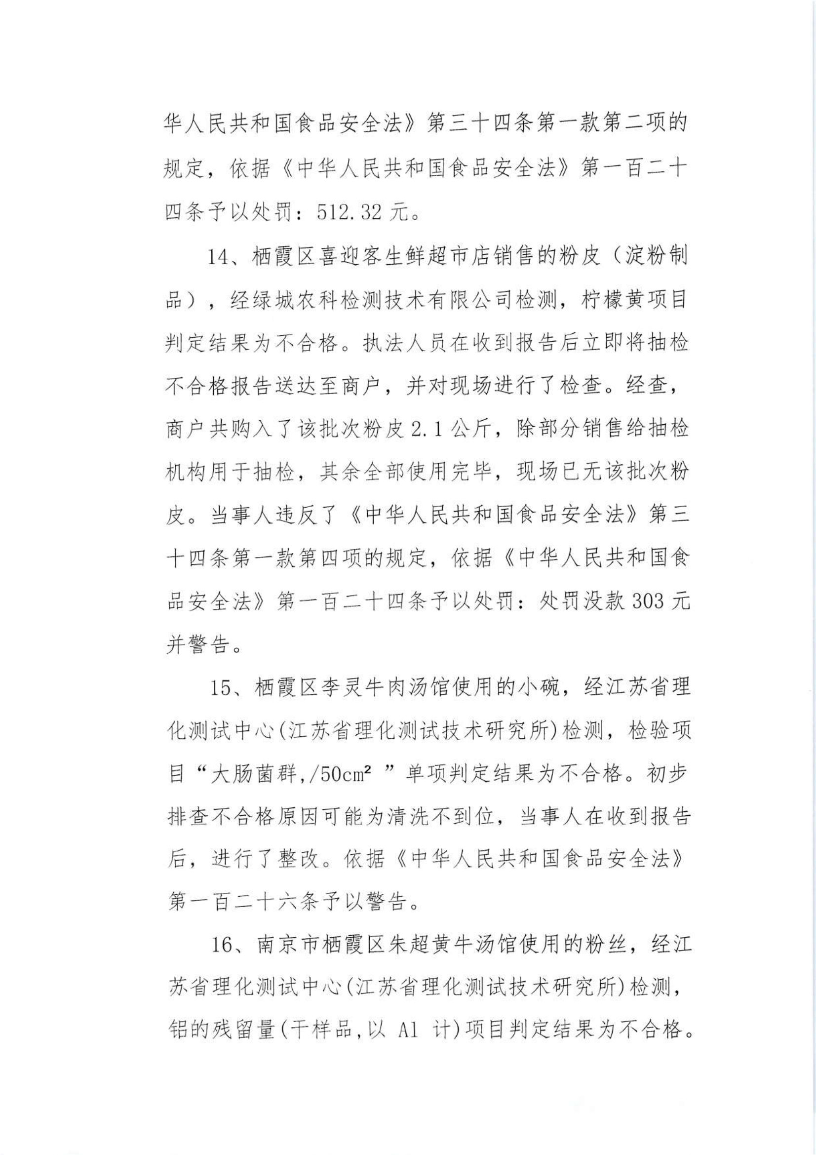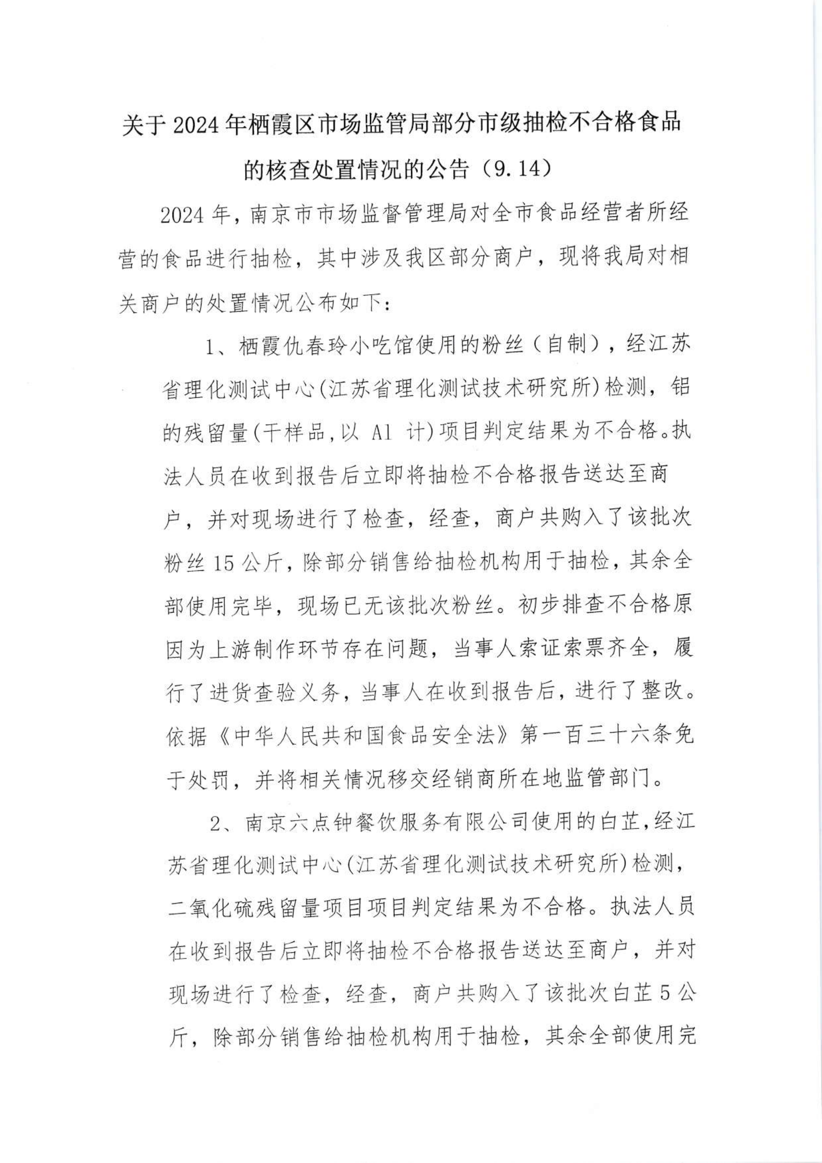 關于2024年棲霞區市場監管局部門市級抽檢不合格食品的核查處置情況的公告(9.14)