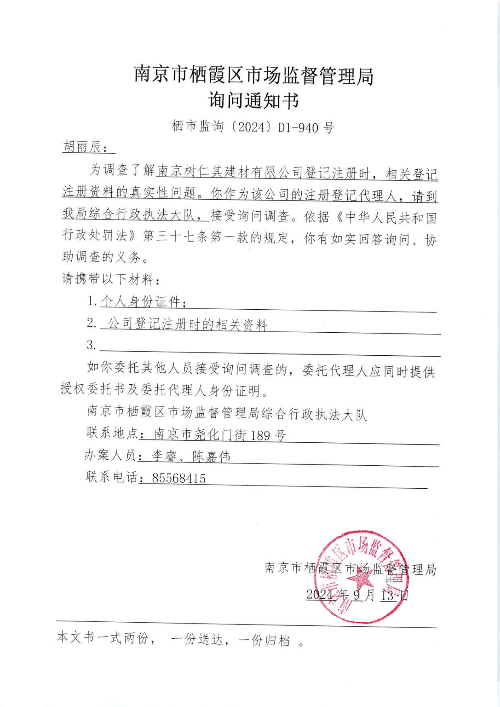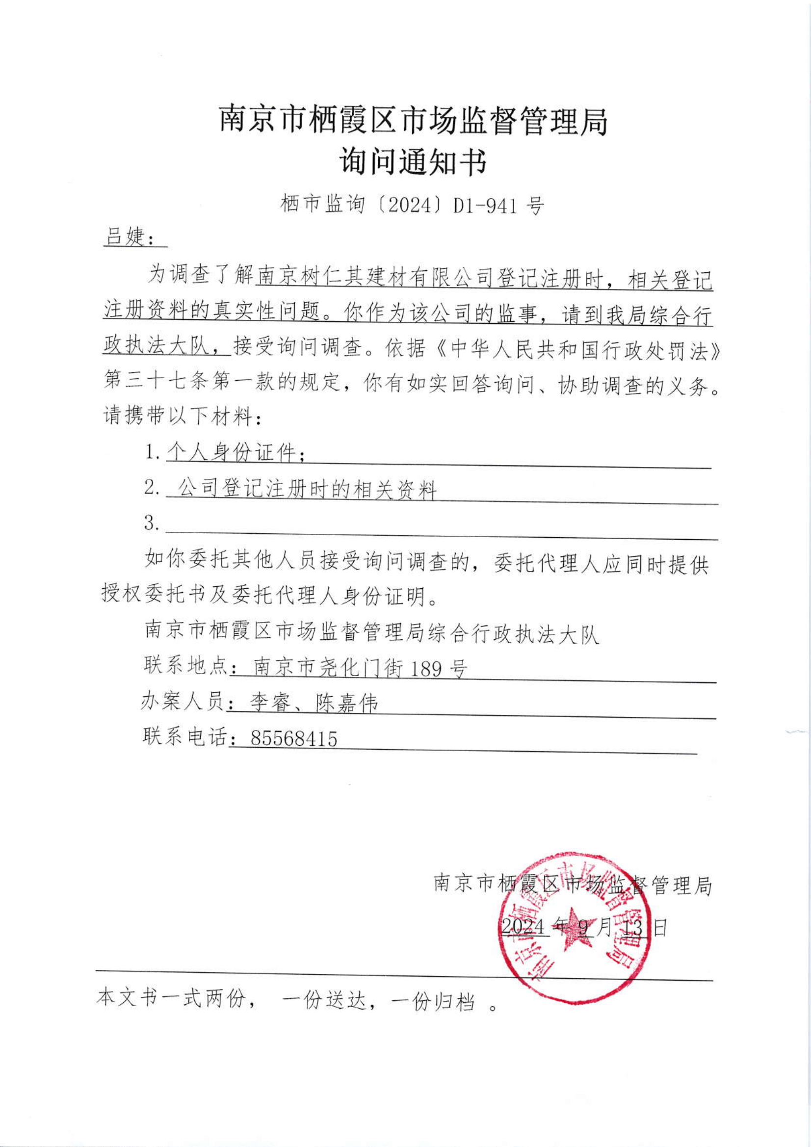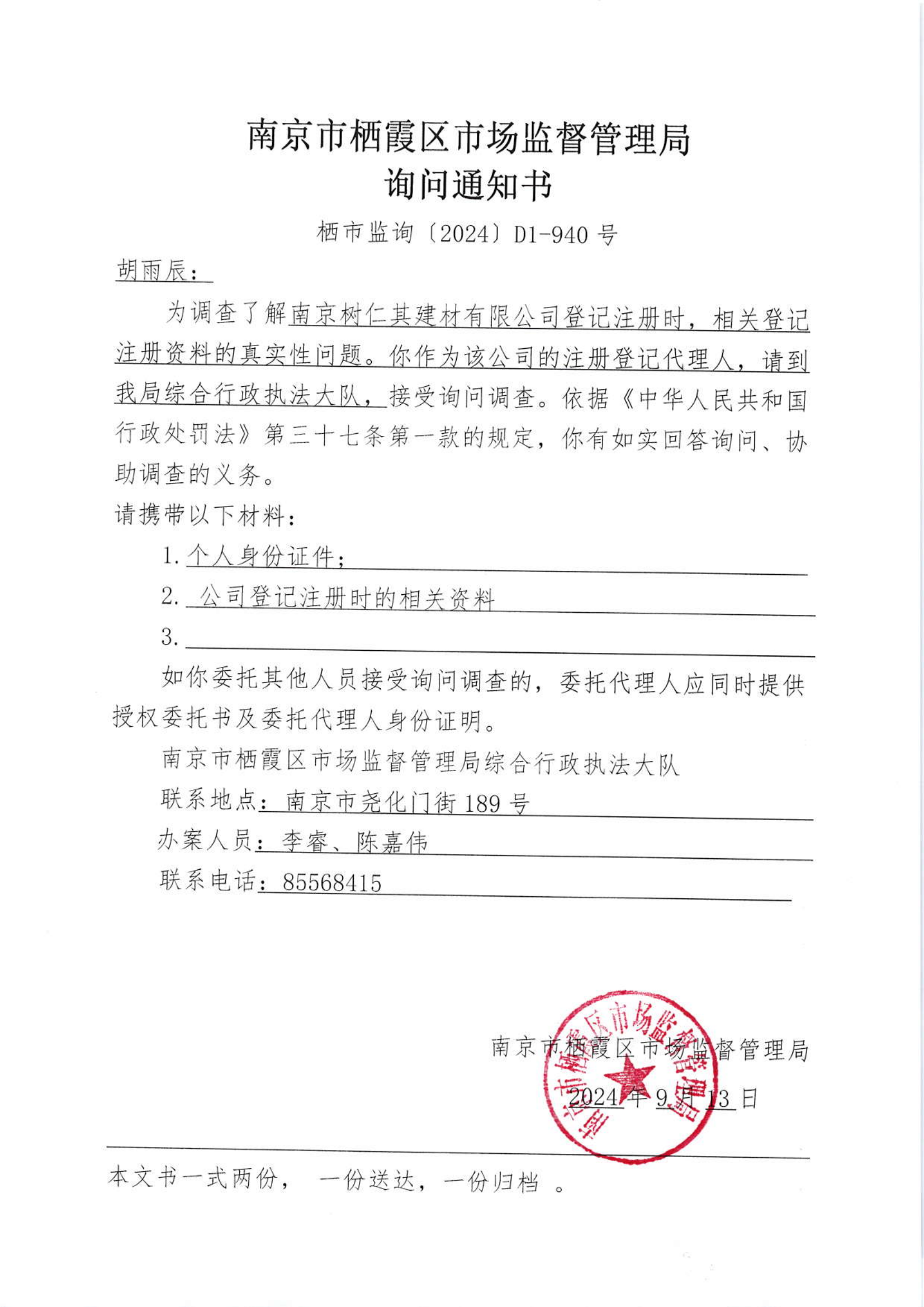 南京市棲霞區市場監督管理局詢問通知書(南京樹仁其建材有限公司)