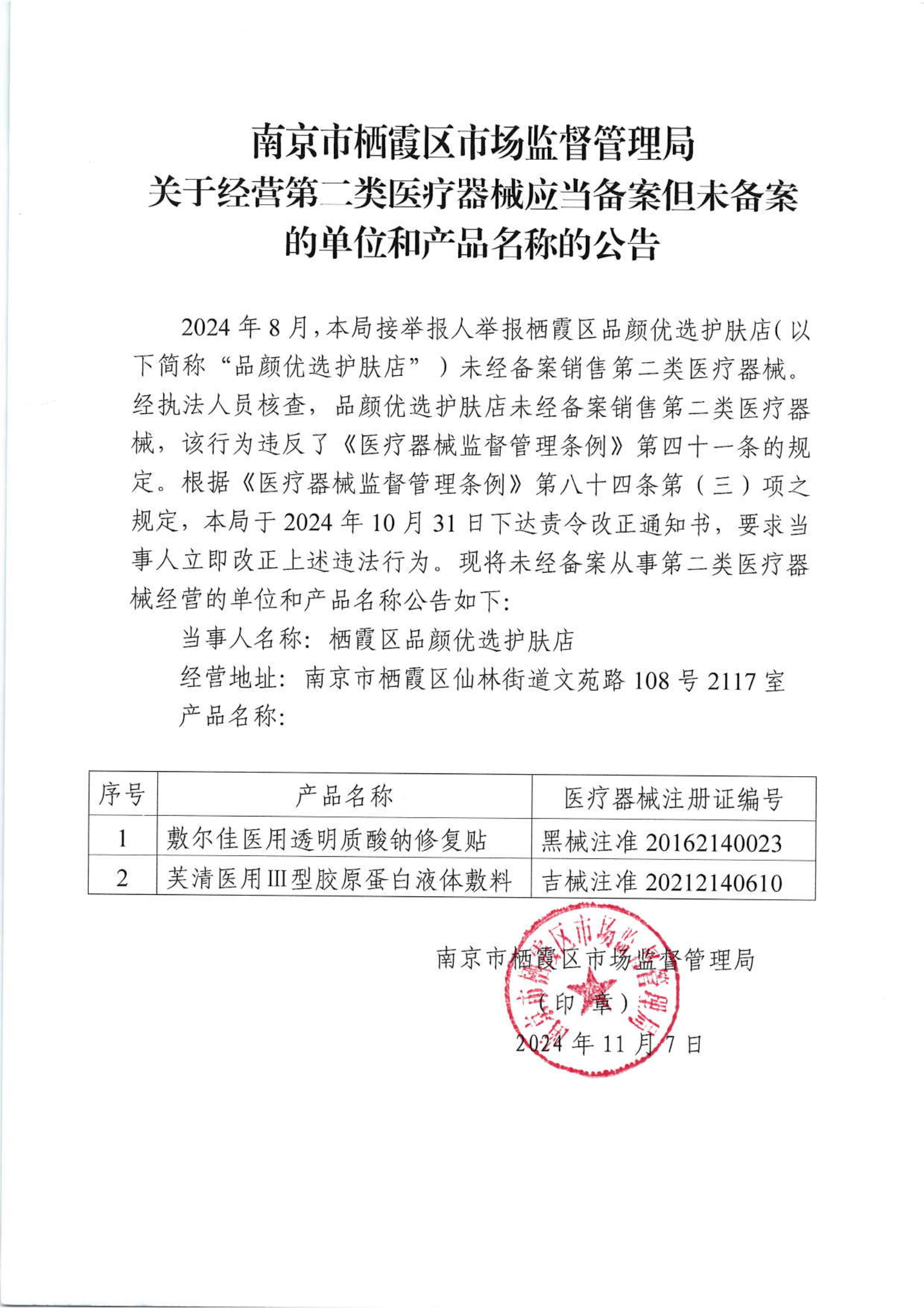 南京市棲霞區市場監督管理局關于經營第二類醫療器械應當備案但未備案的單位和產品名稱的公告