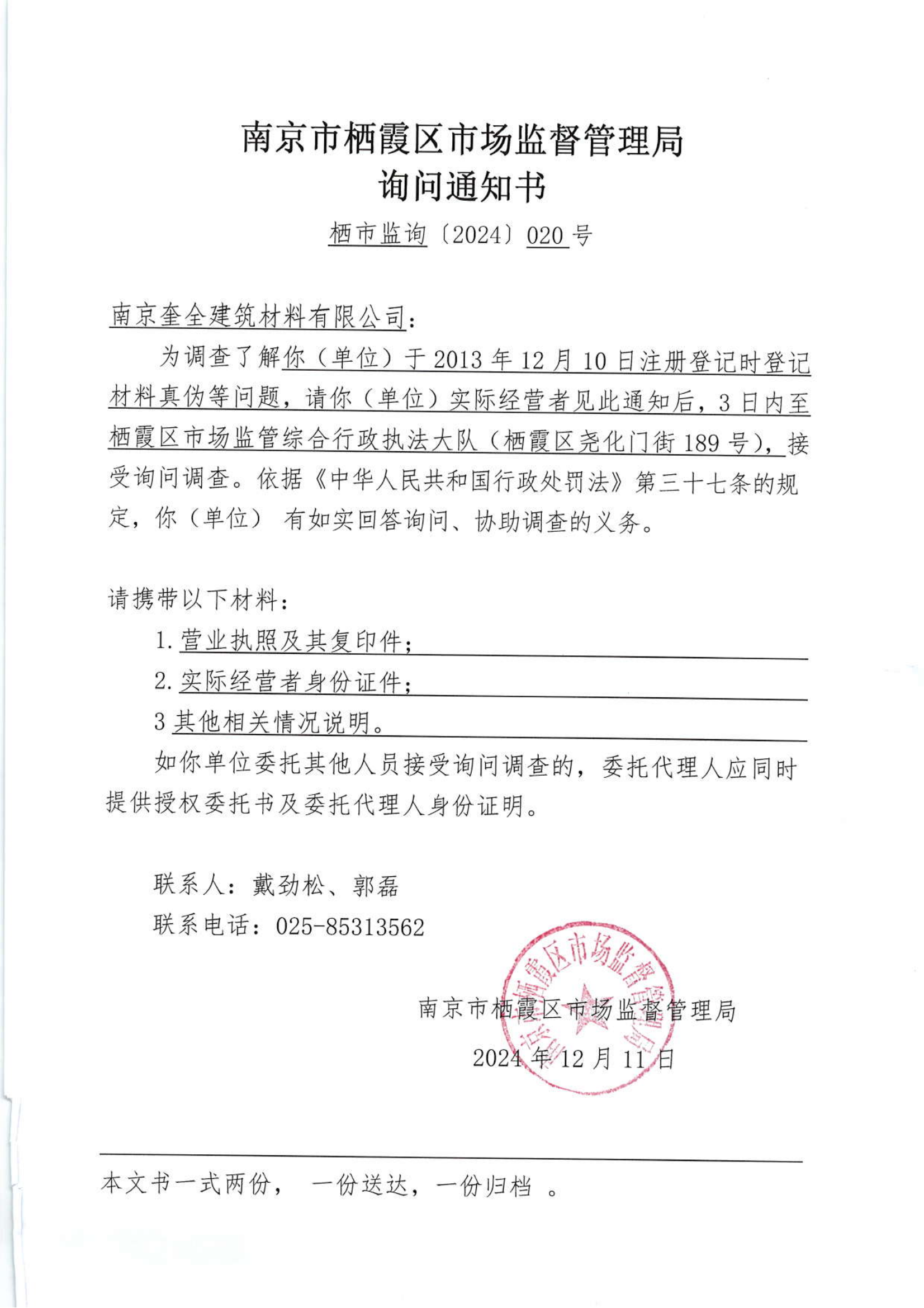 南京市棲霞區市場監督管理局詢問通知書(南京奎全建筑材料有限公司)