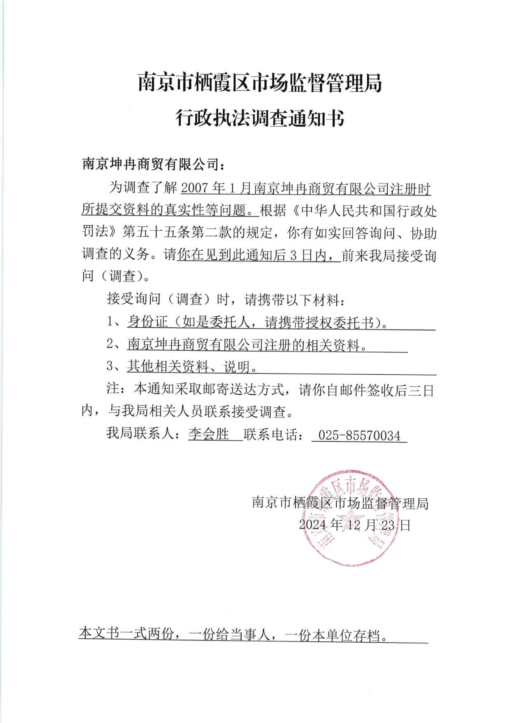 南京市棲霞區(qū)市場監(jiān)督管理局行政執(zhí)法調(diào)查通知書(南京坤冉商貿(mào)有限公司)