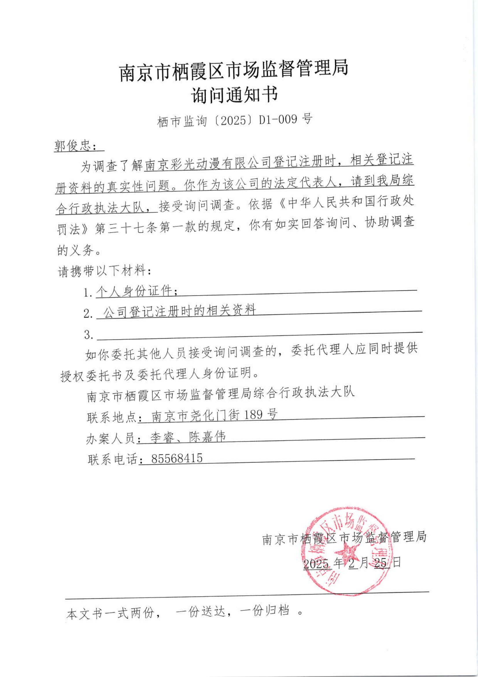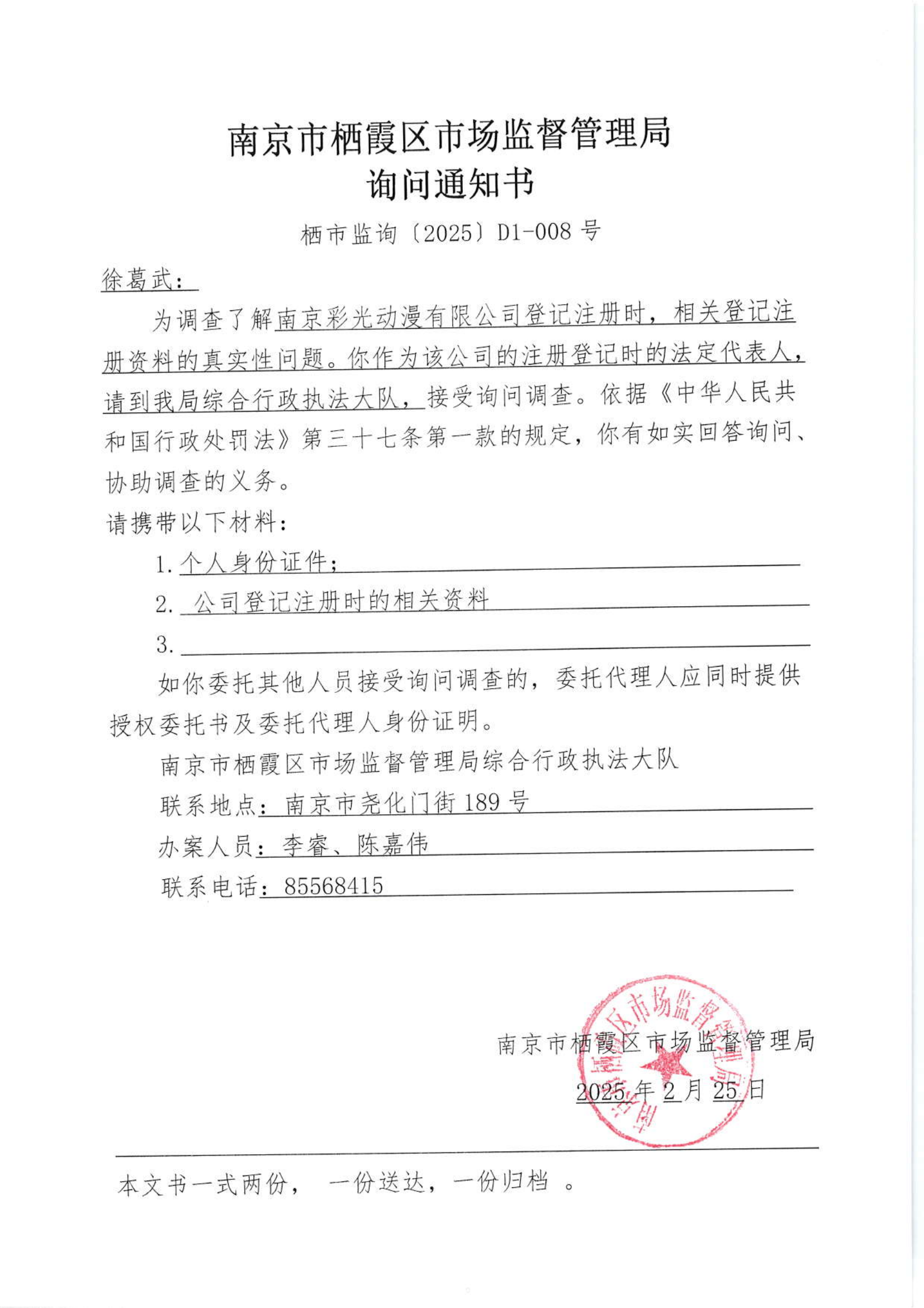 南京市棲霞區市場監督管理局詢問通知書( 南京彩光動漫有限公司)