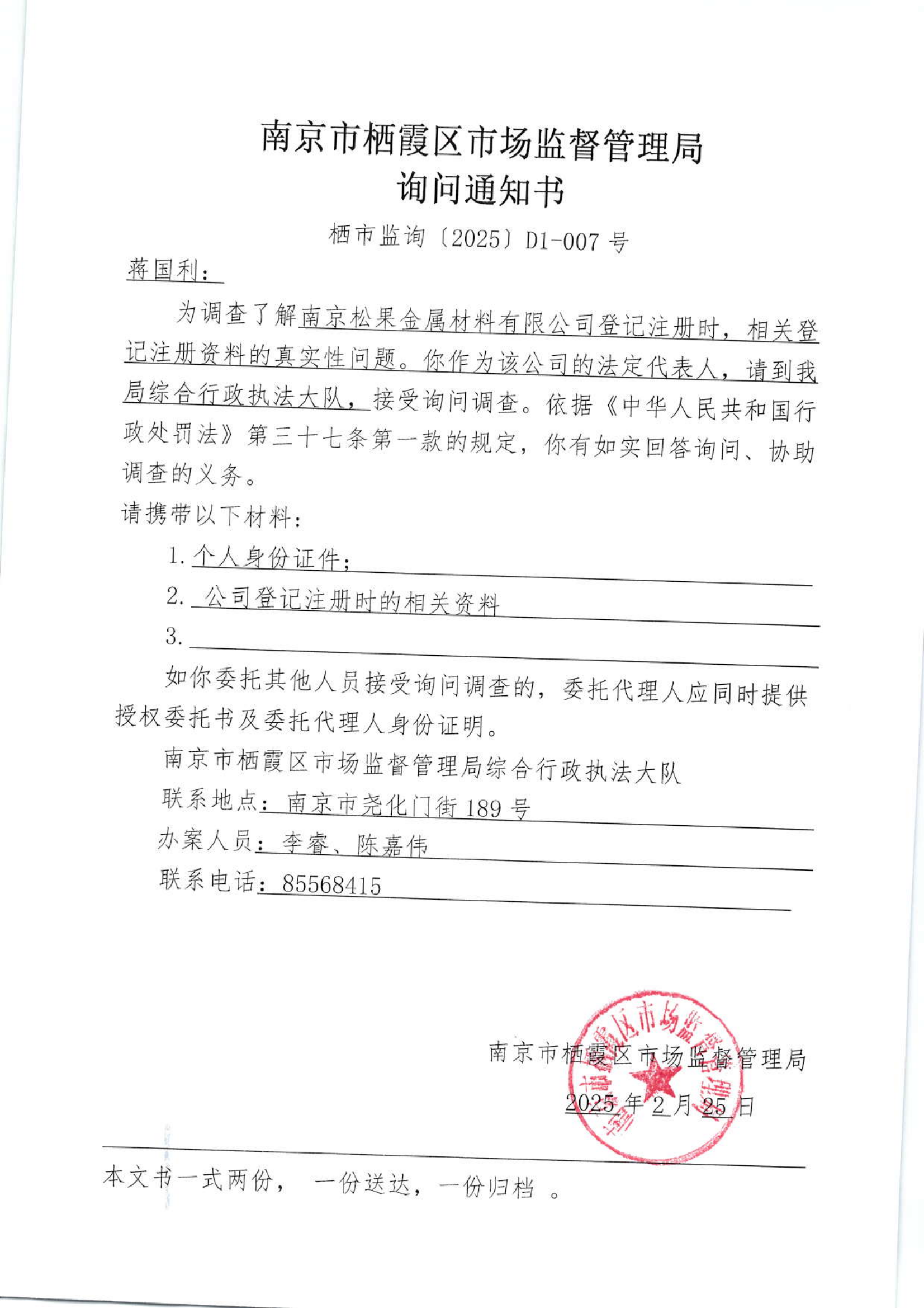 南京市棲霞區(qū)市場(chǎng)監(jiān)督管理局詢問通知書(南京松果金屬材料有限公司 )