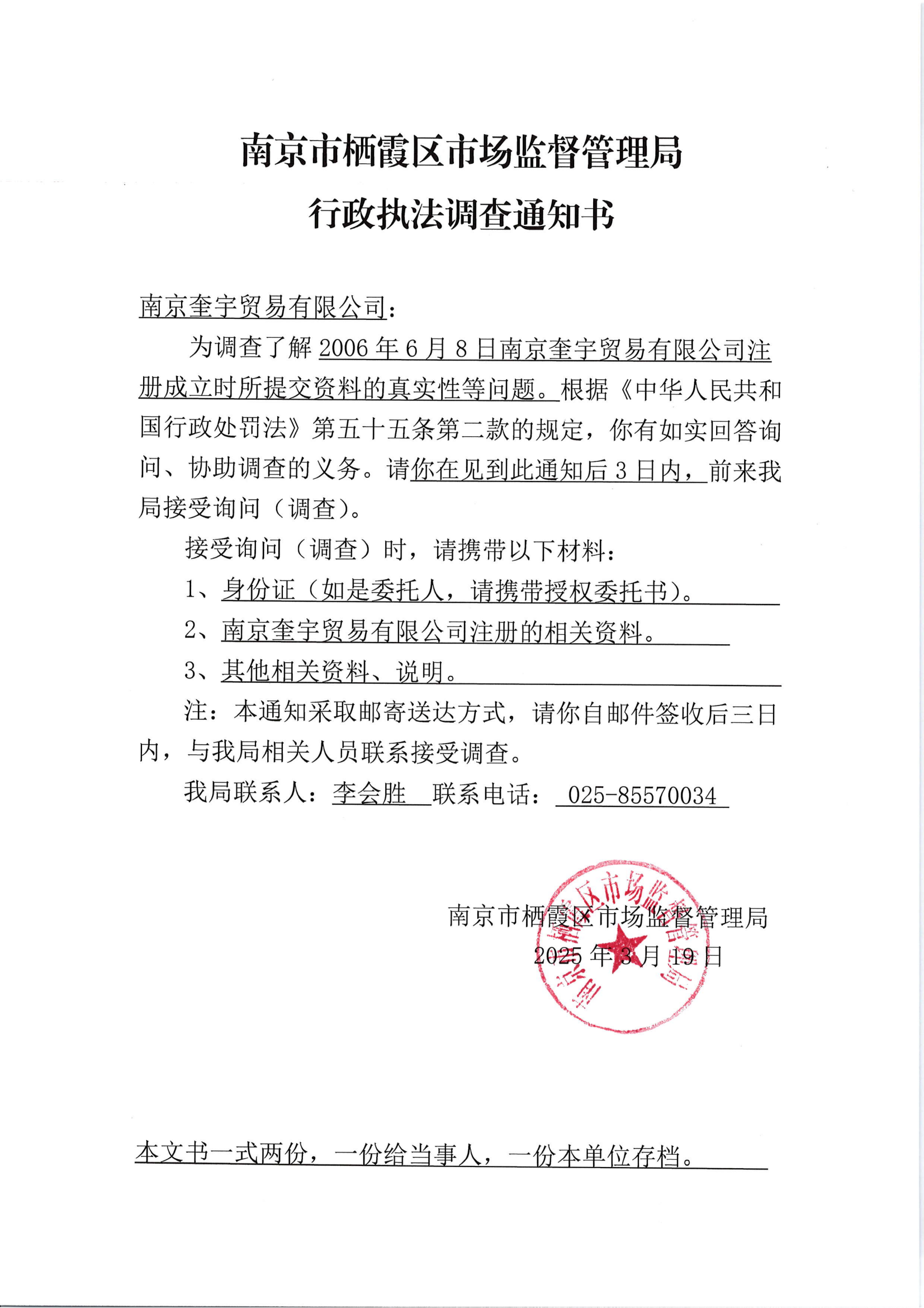 南京市棲霞區(qū)市場(chǎng)監(jiān)督管理局行政執(zhí)法調(diào)查通知書(shū)(南京奎宇貿(mào)易有限公司)
