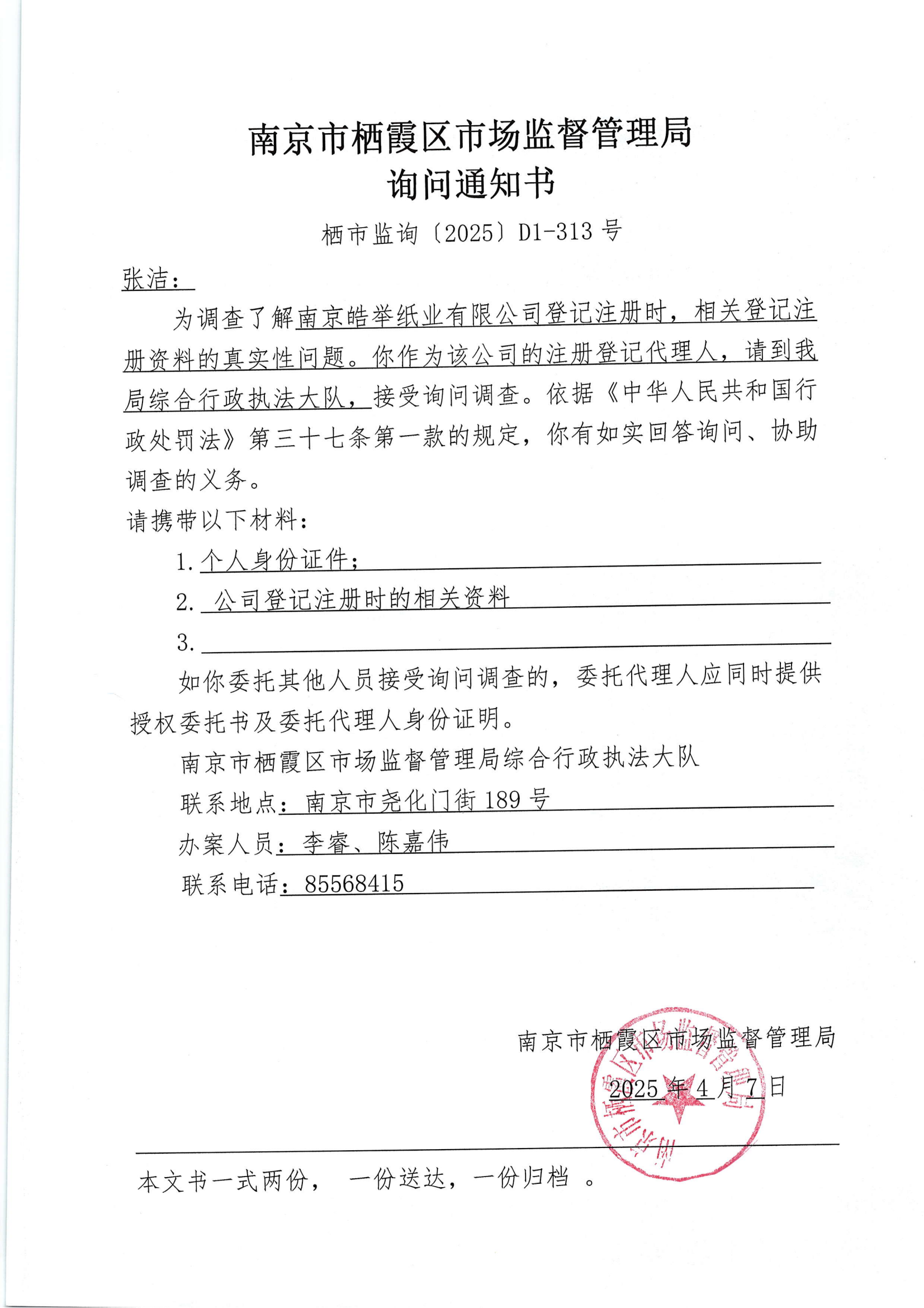 南京市棲霞區市場監督管理局詢問通知書(南京皓舉紙業有限公司)