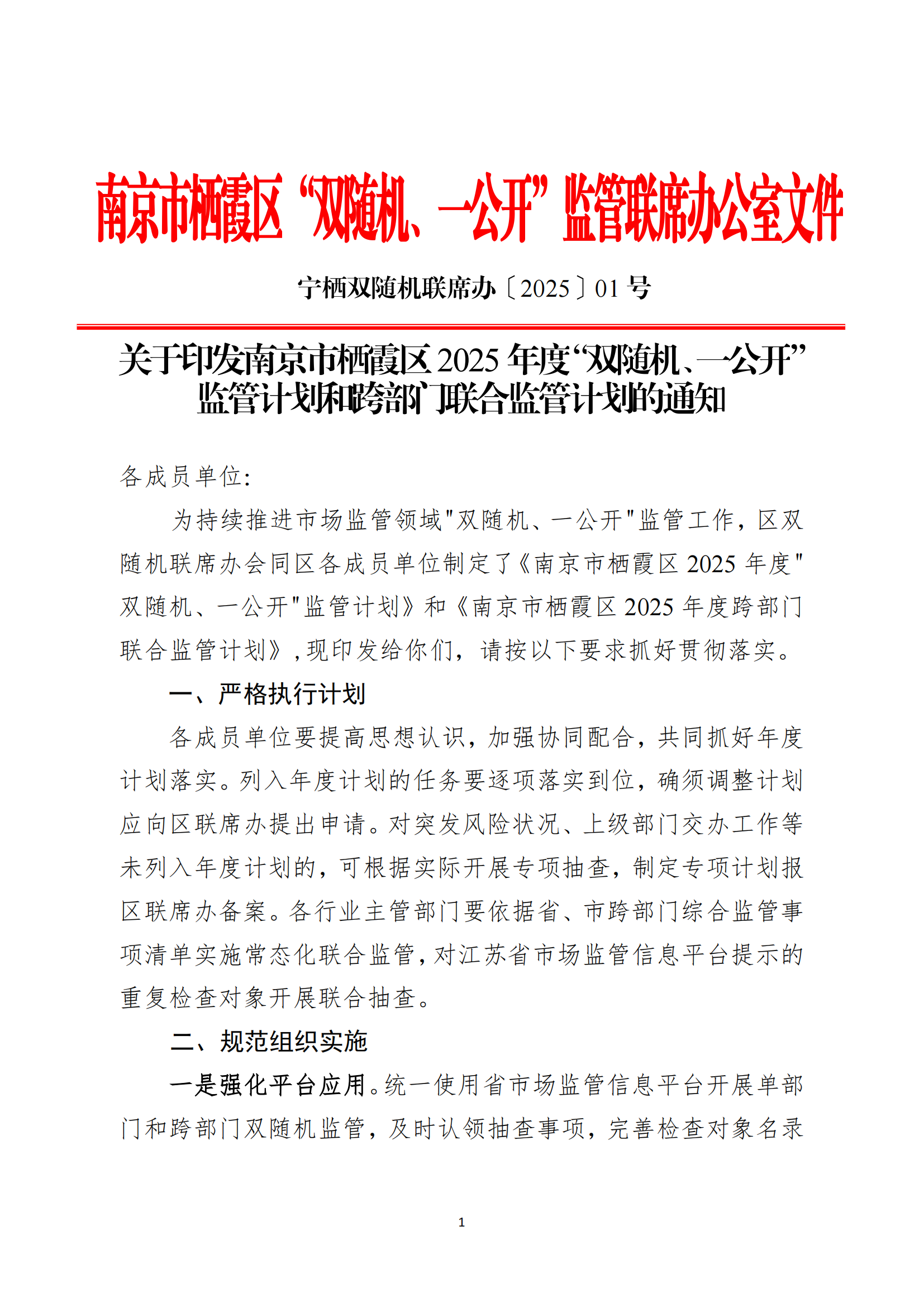 關于印發南京市棲霞區2025年度“雙隨機、一公開” 監管計劃和跨部門聯合監管計劃的通知