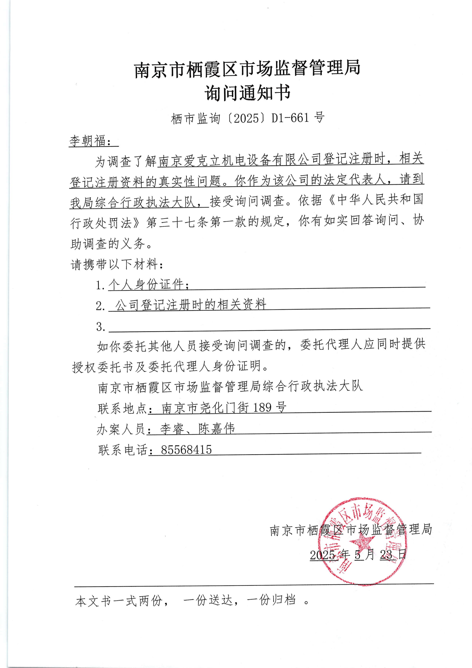 南京市棲霞區市場監督管理局詢問通知書(南京愛克立機電設備有限公司)