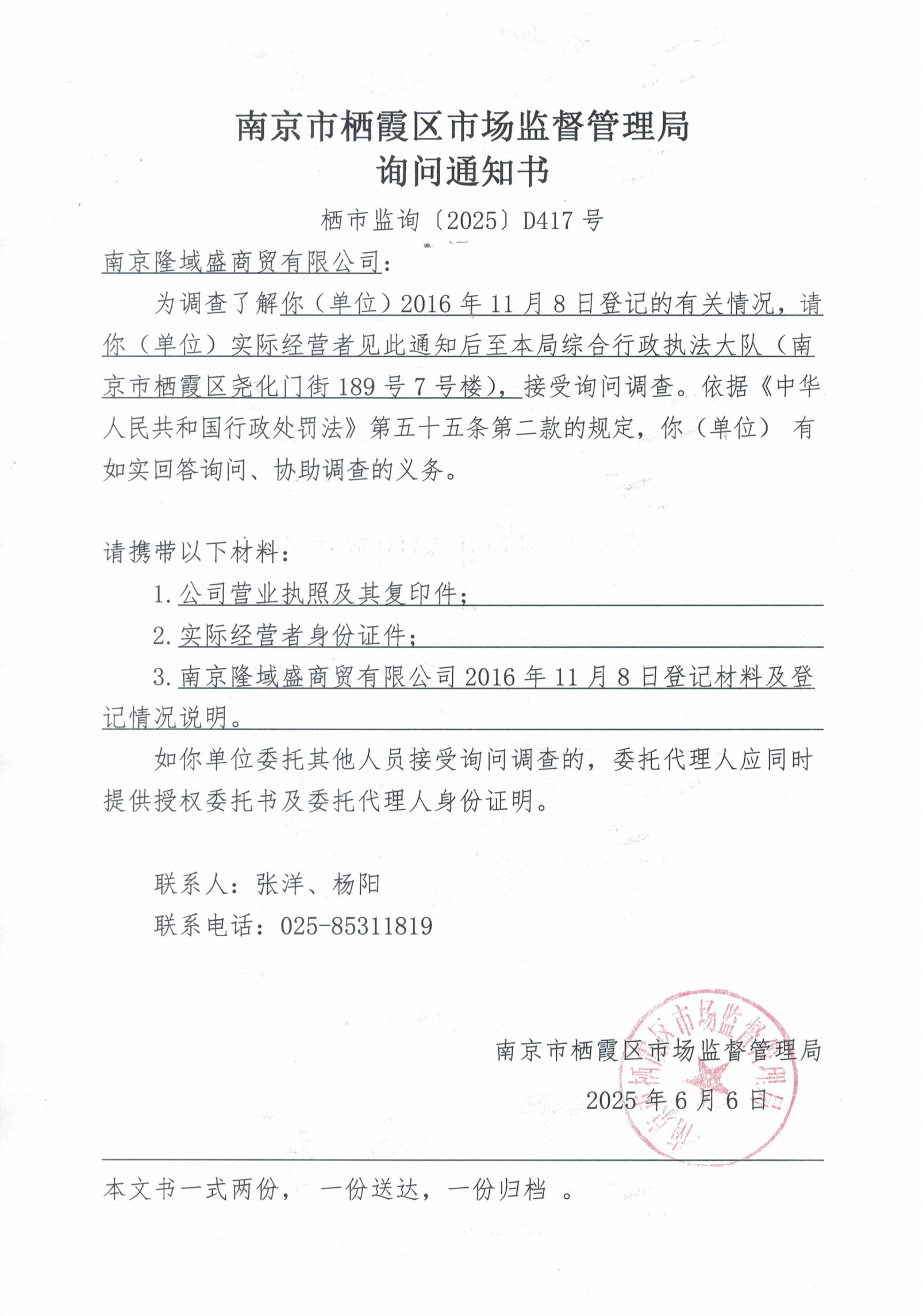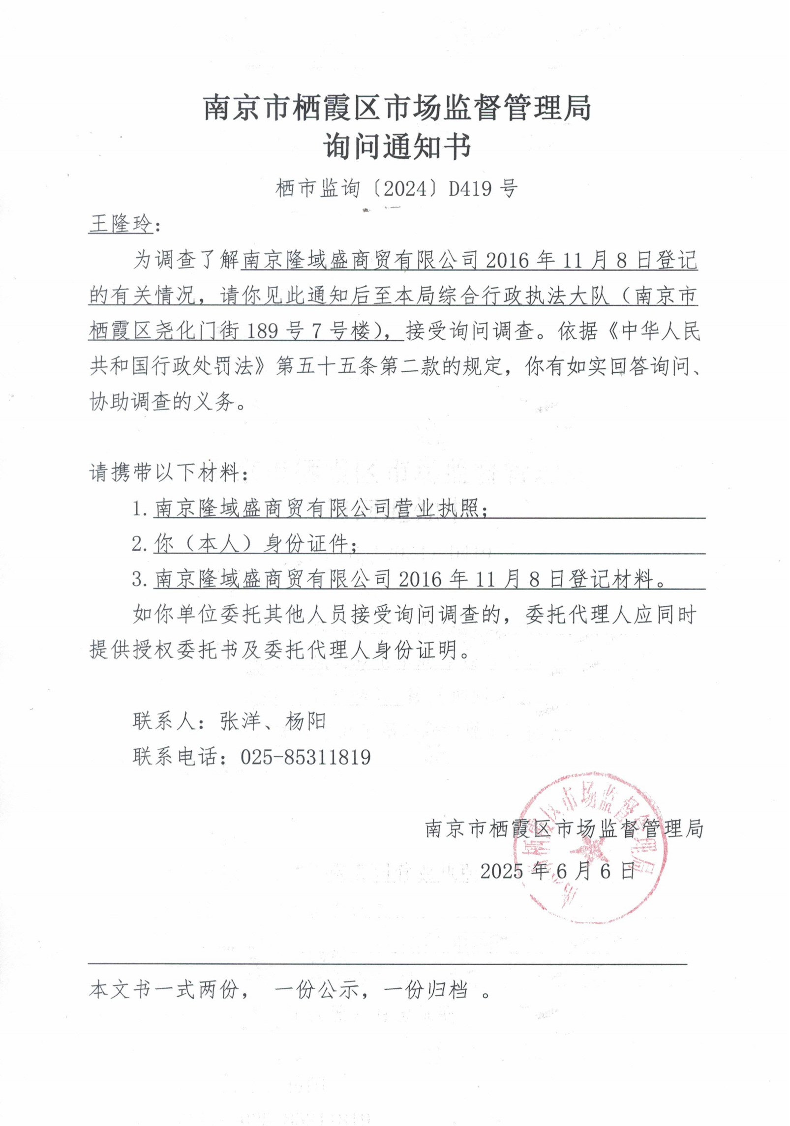信息名稱:    南京市棲霞區市場監督管理局詢問通知書(南京隆域盛商貿有限公司、監事袁興倉、登記經辦人王隆玲)