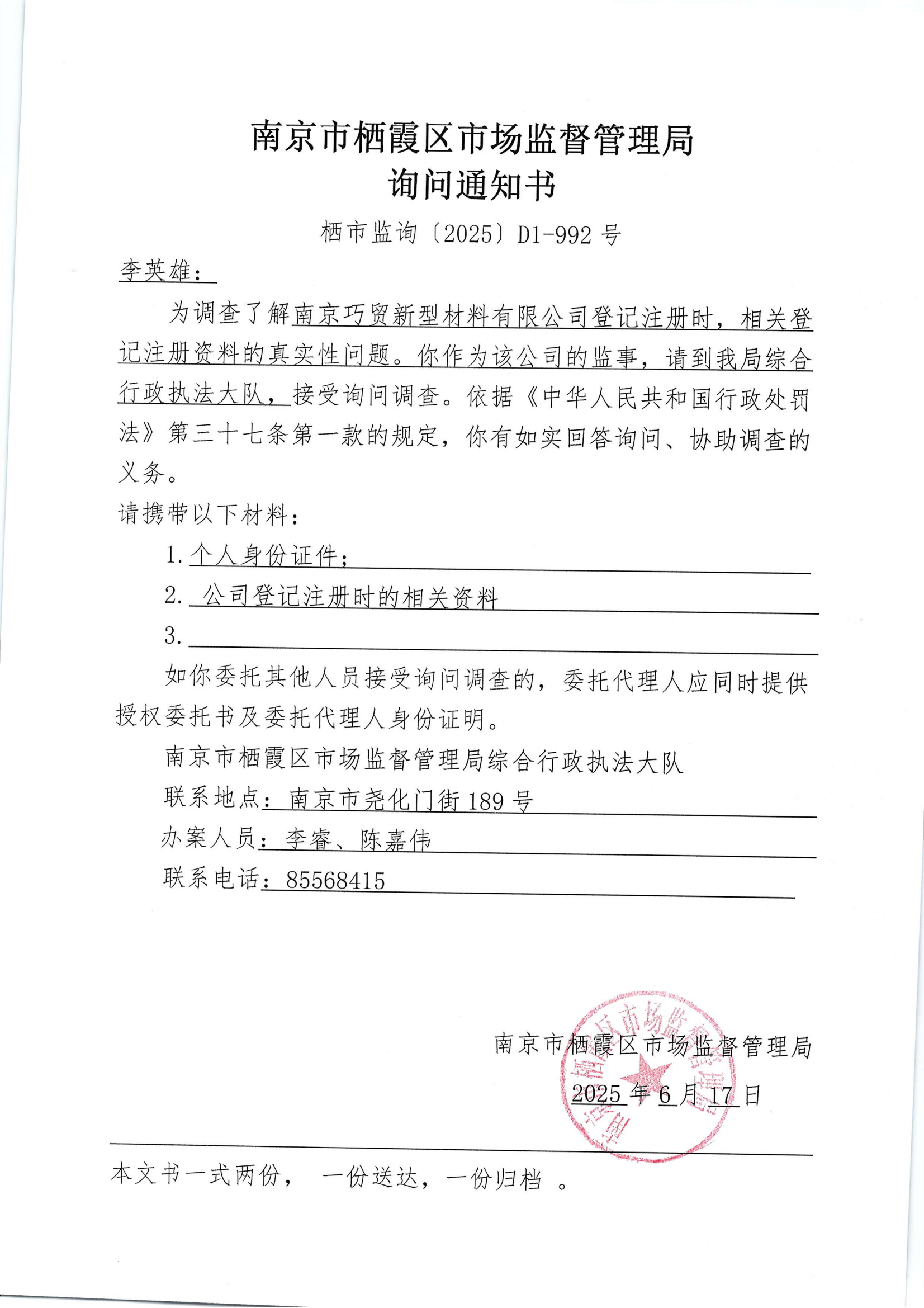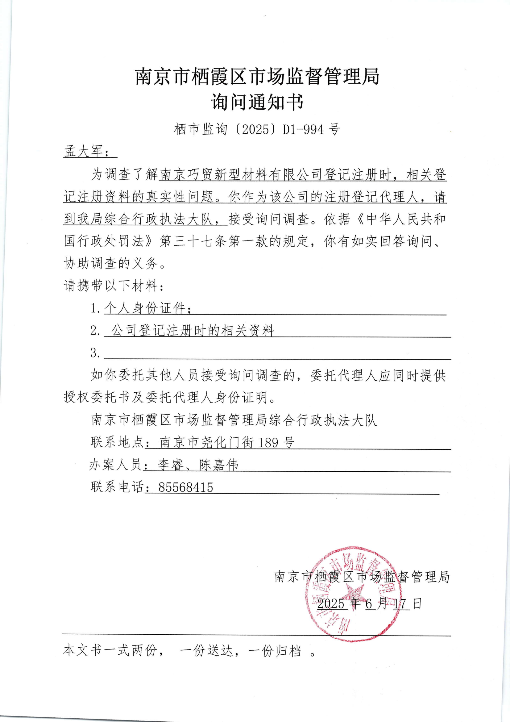 棲霞區市場監督管理局詢問通知書(南京巧貿新型材料有限公司)