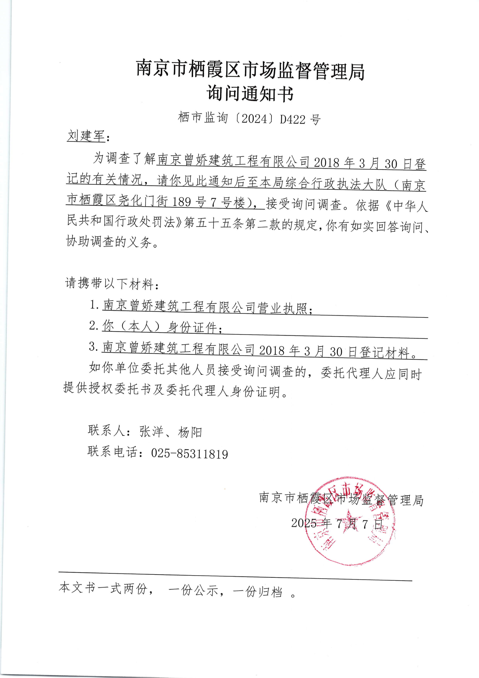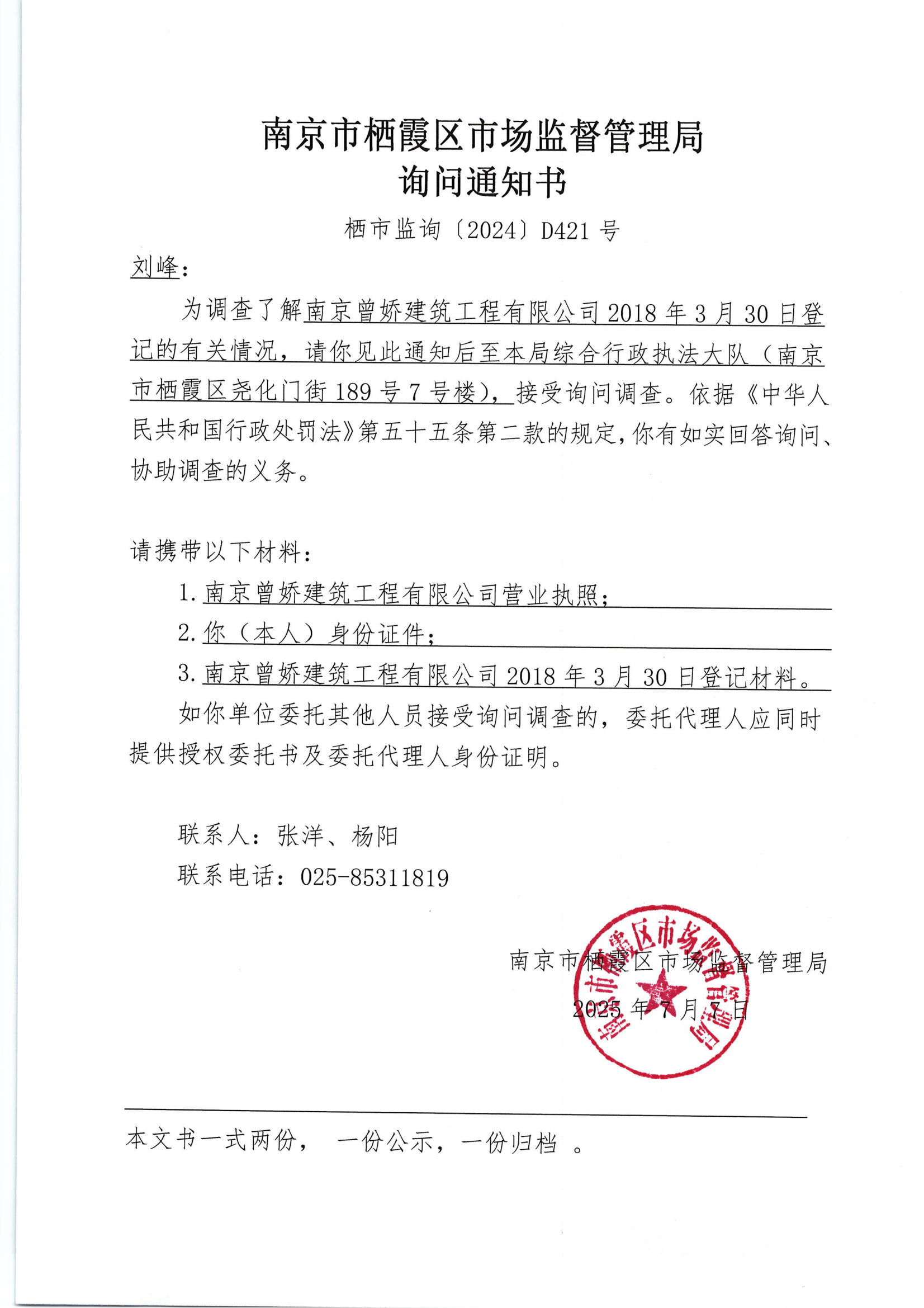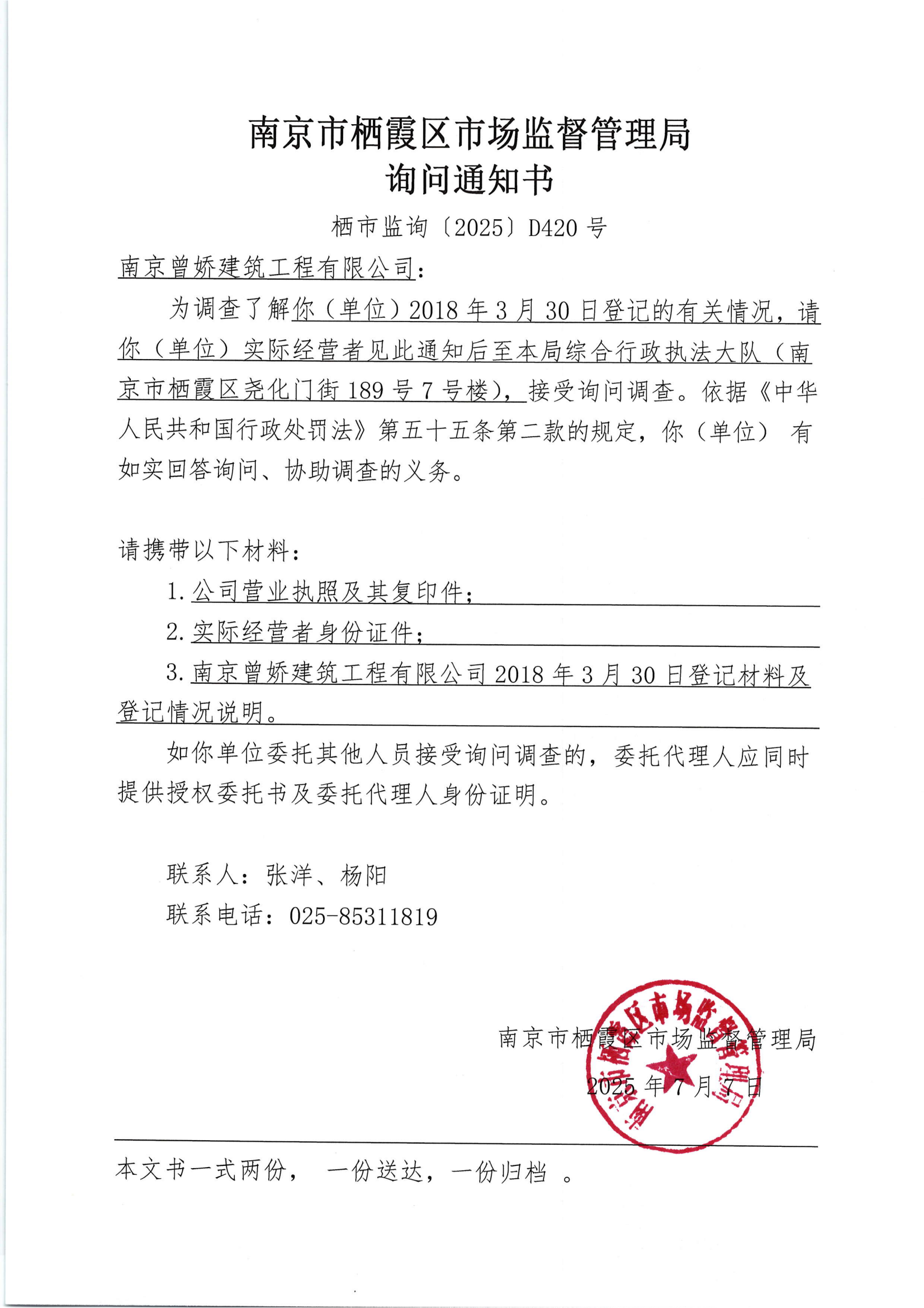南京市棲霞區(qū)市場監(jiān)督管理局詢問通知書(南京曾嬌建筑工程有限公司)