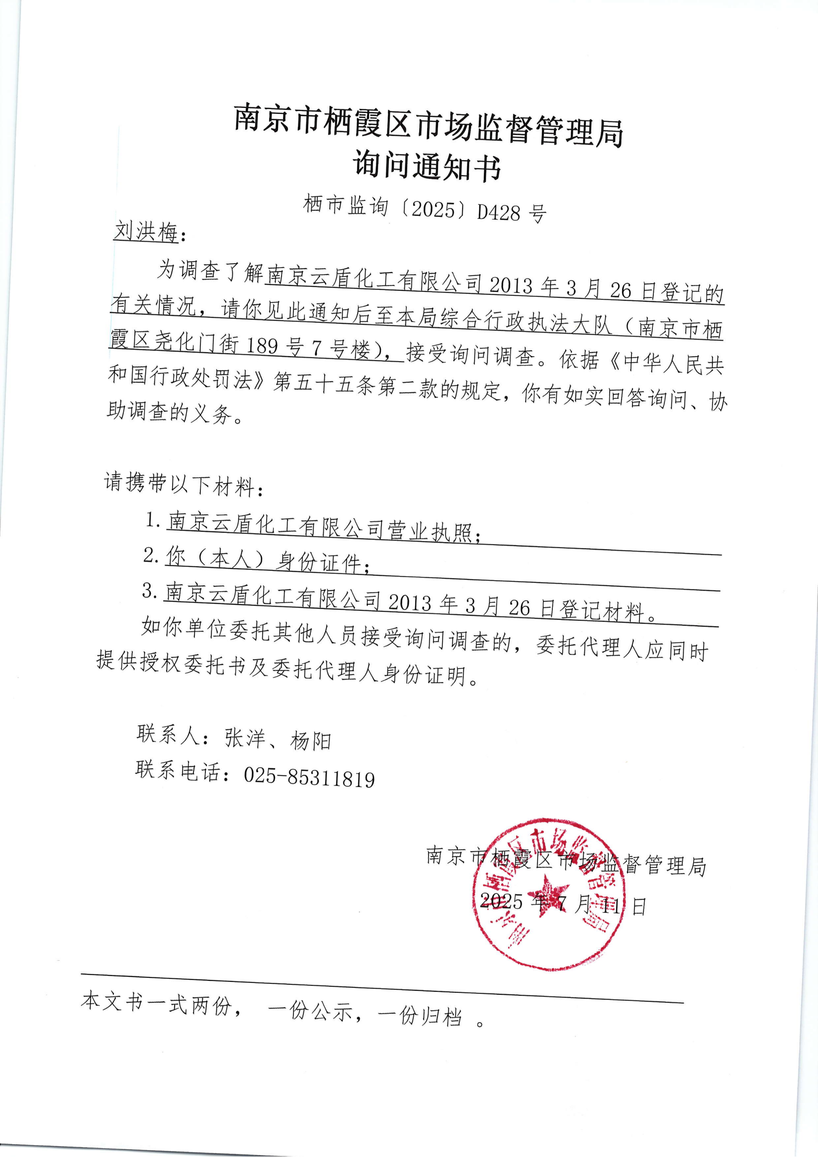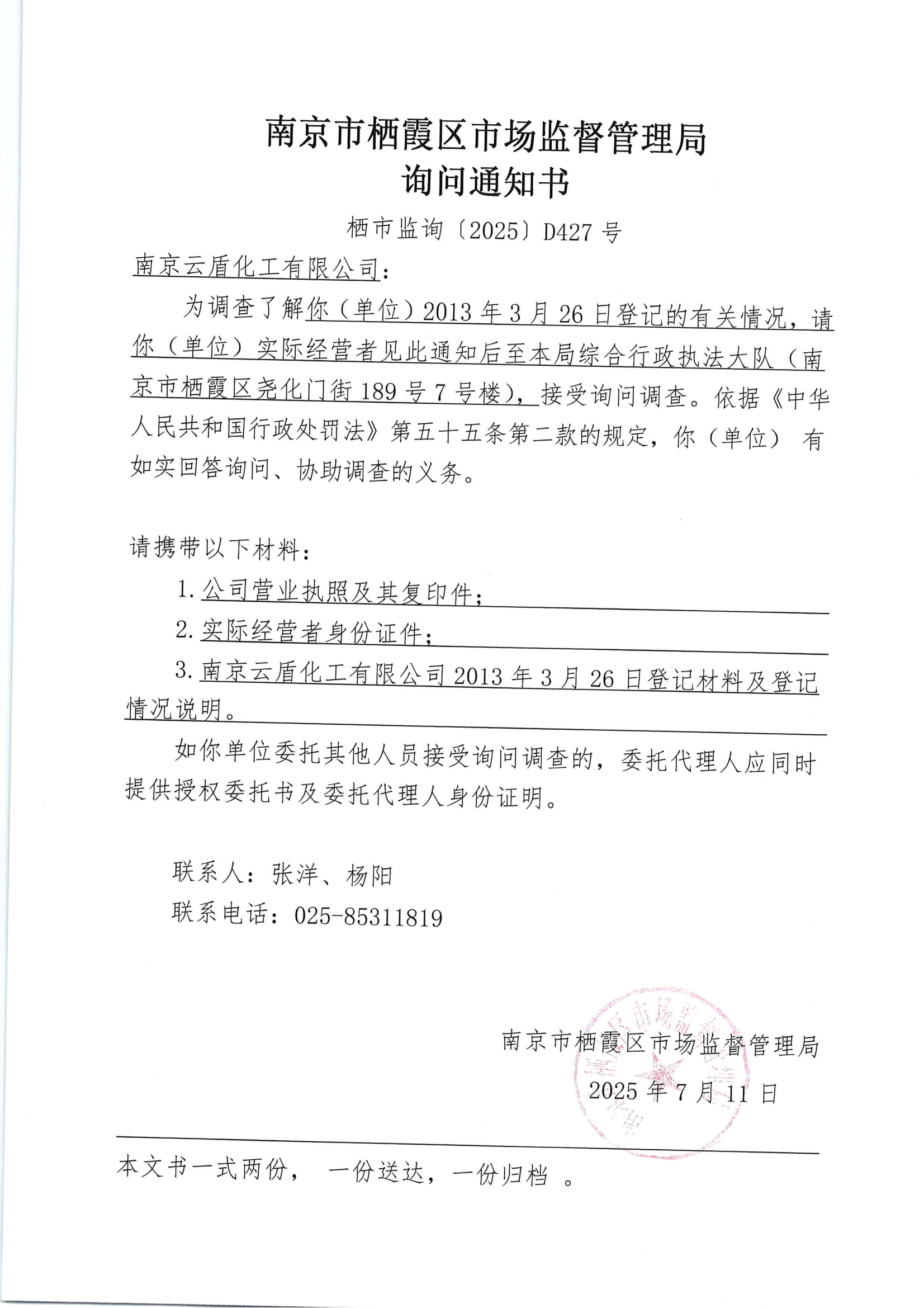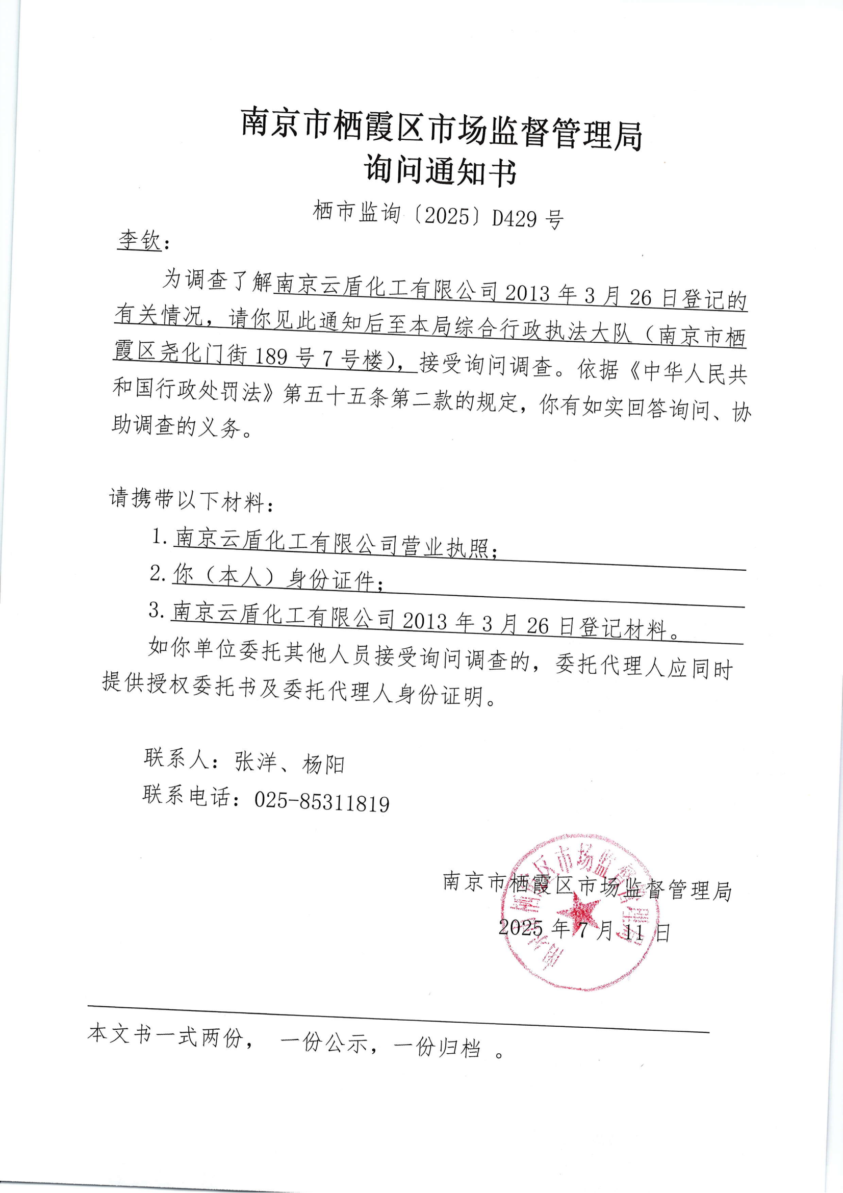棲霞區市場監督管理局詢問通知書(南京云盾化工有限公司)