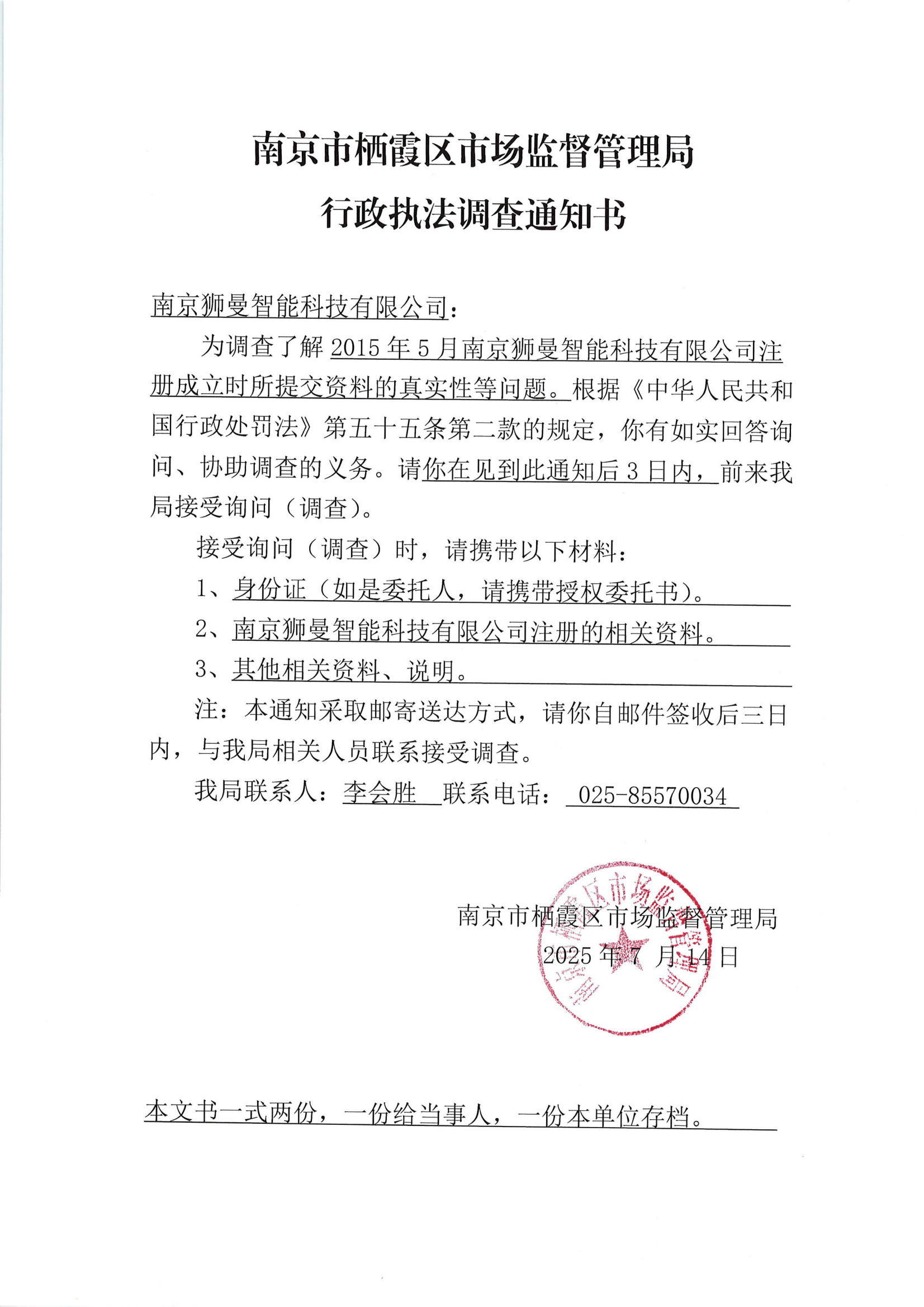 南京市棲霞區(qū)市場監(jiān)督管理局行政執(zhí)法調(diào)查通知書(南京獅曼智能科技有限公司)