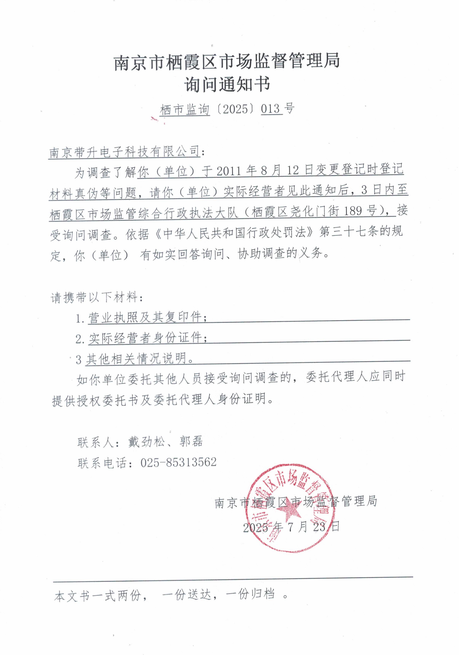 棲霞區(qū)市場監(jiān)督管理局詢問通知書南京帶升電子科技有限公司