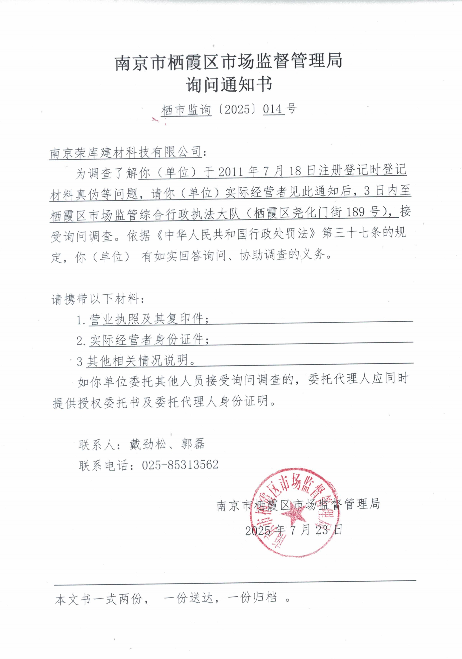 棲霞區市場監督管理局詢問通知書南京榮庫建材科技有限公司