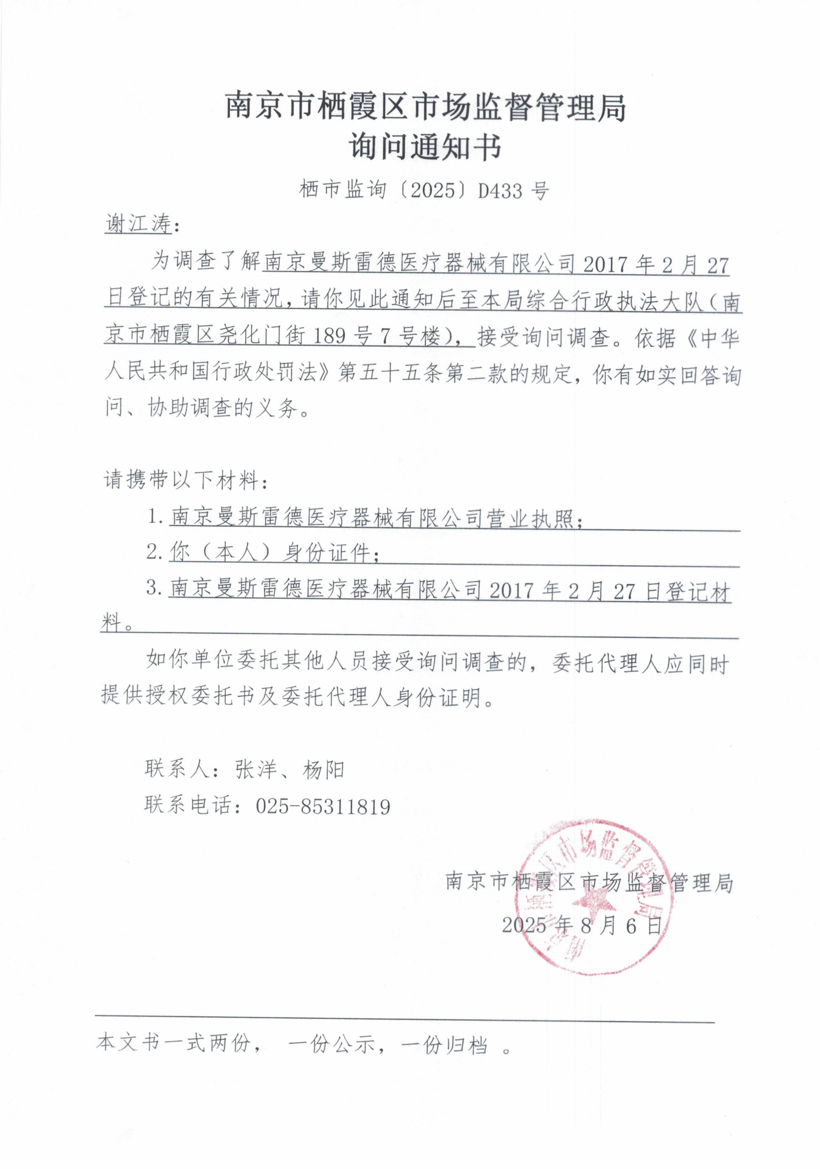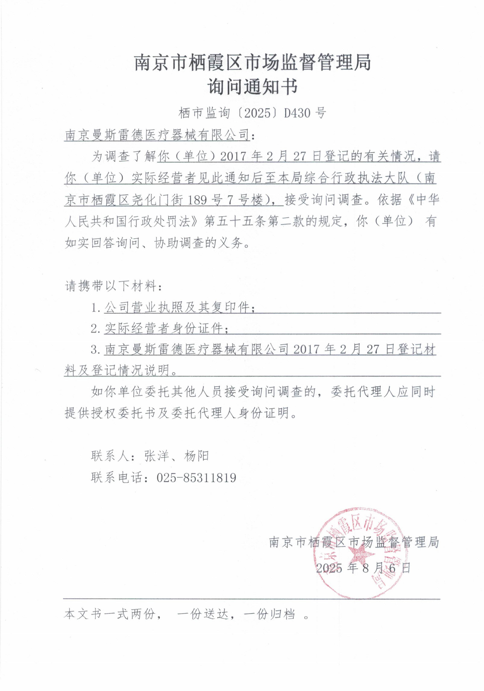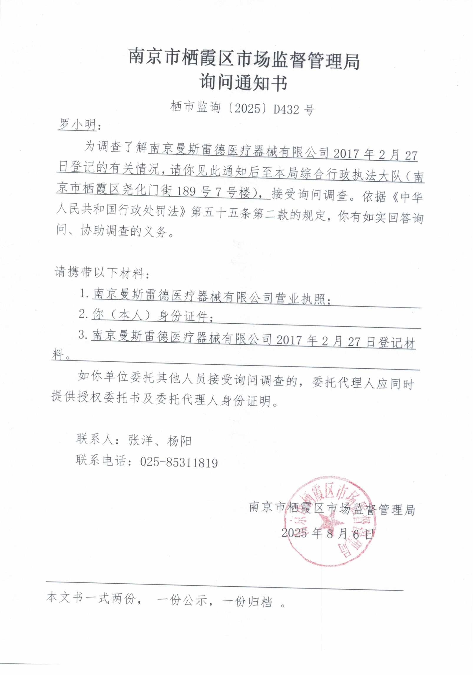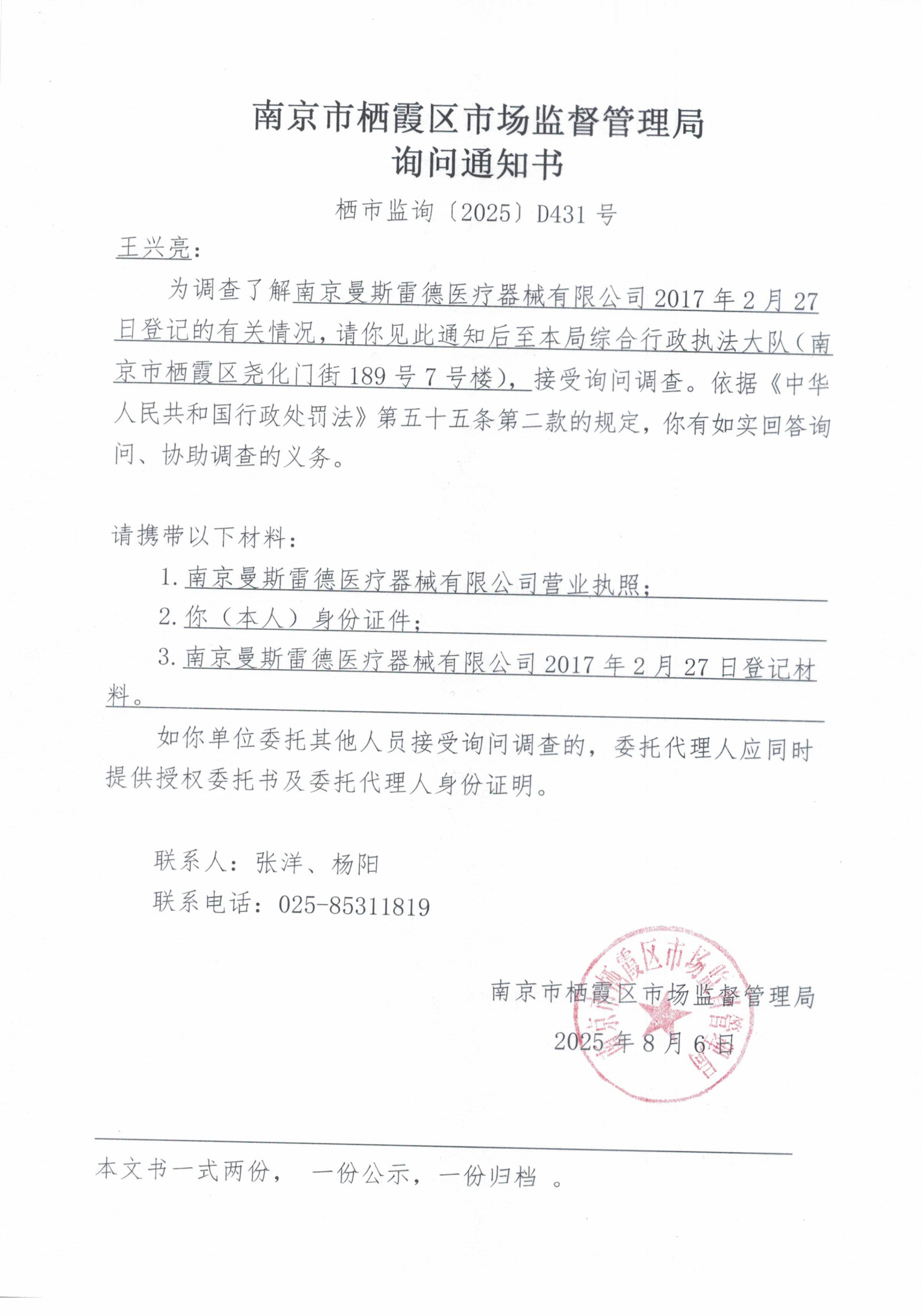 南京市棲霞區市場監督管理局詢問通知書(南京曼斯雷德醫療器械有限公司)