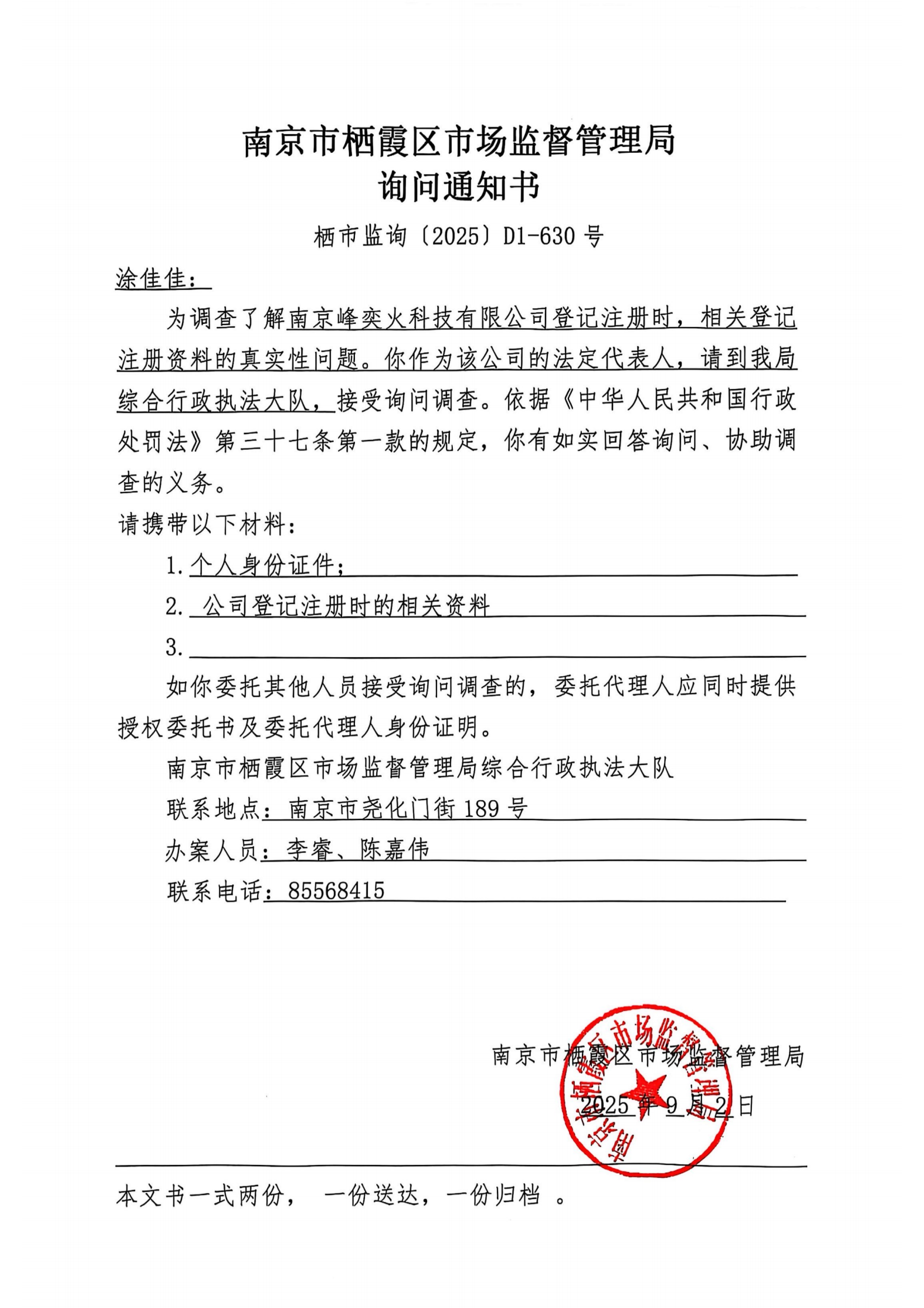 南京市棲霞區市場監督管理局詢問通知書(南京峰奕火科技有限公司)