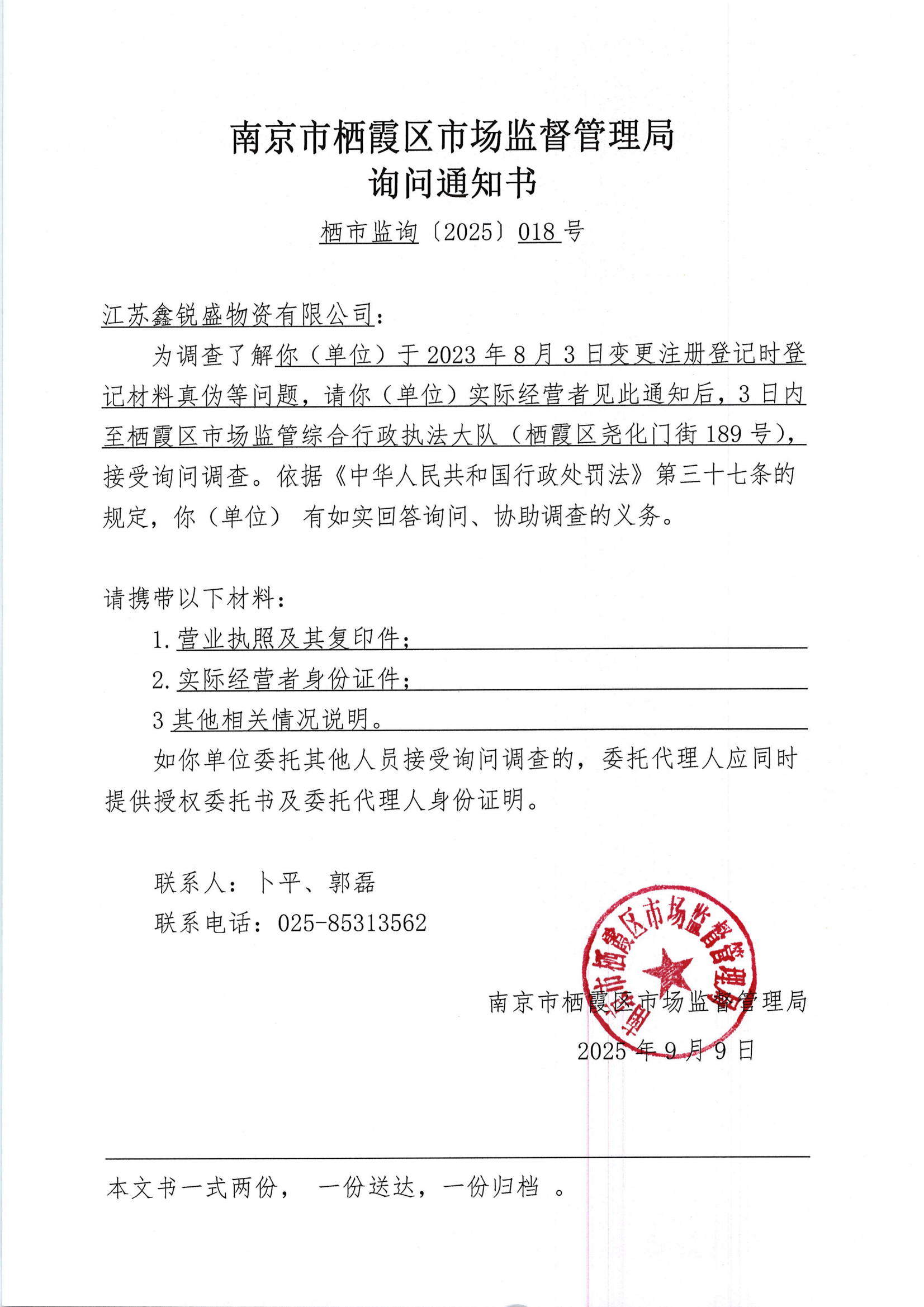 南京市棲霞區市場監督管理局詢問通知書(江蘇鑫銳盛物資有限公司)