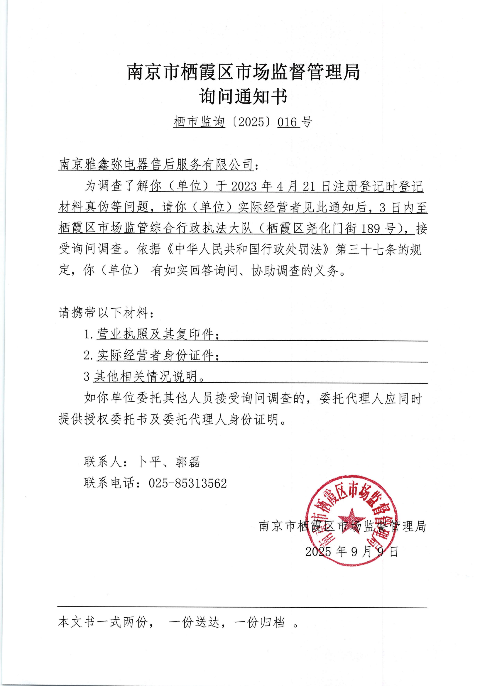 南京市棲霞區(qū)市場監(jiān)督管理局詢問通知書(南京雅鑫彌電器售后服務(wù)有限公司)