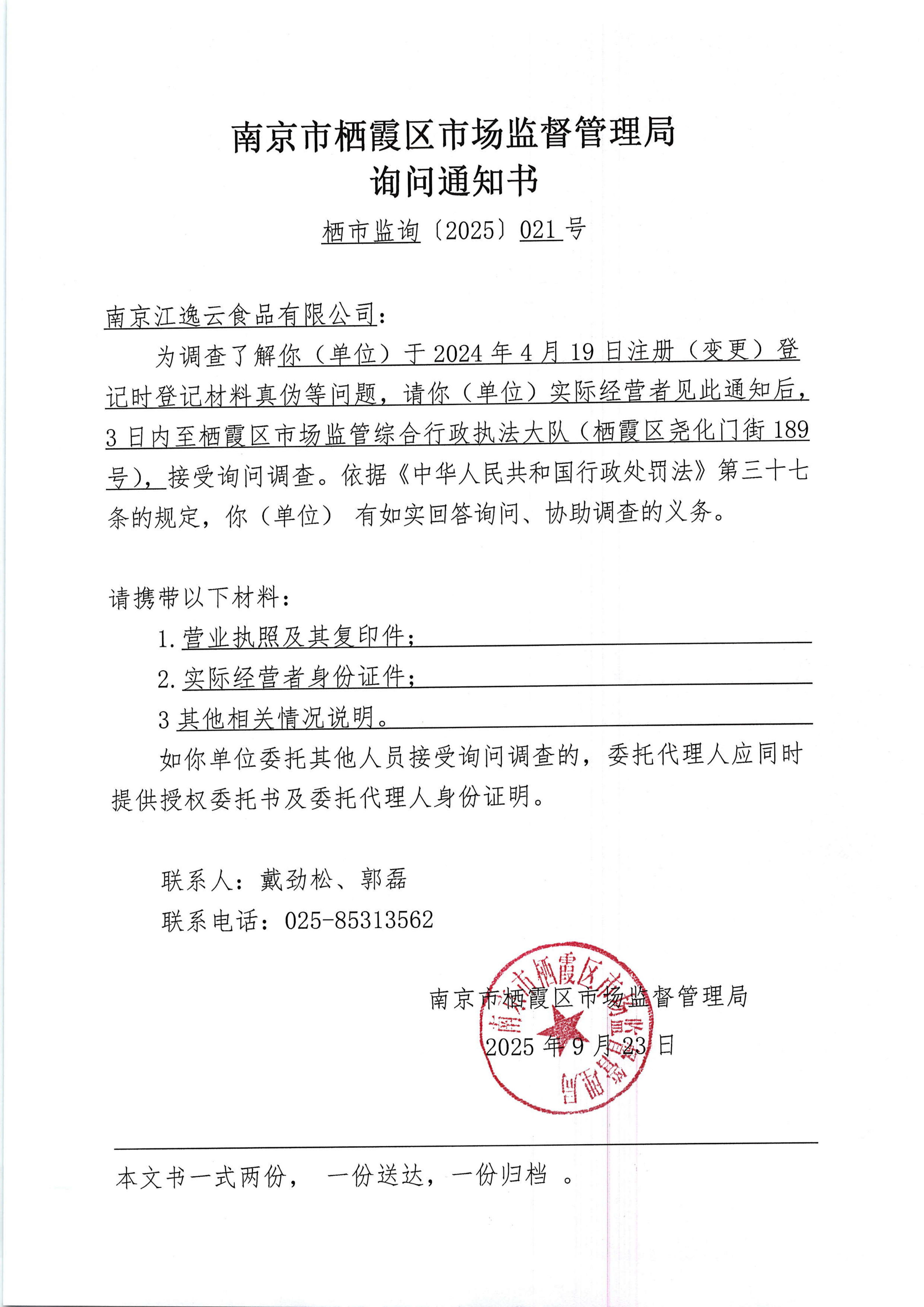 南京市棲霞區市場監督管理局詢問通知書(南京江逸云食品有限公司)