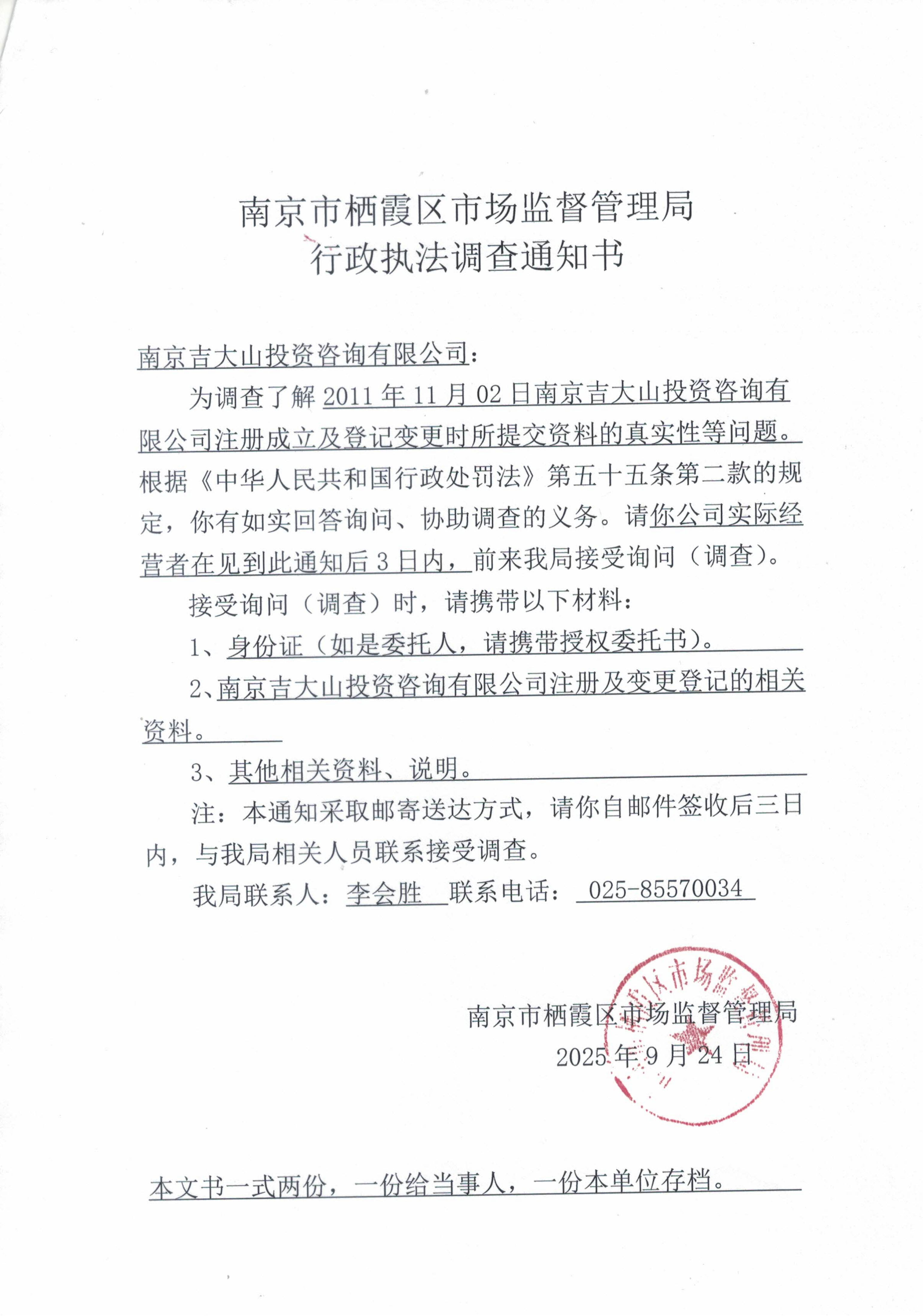 南京市棲霞區(qū)市場(chǎng)監(jiān)督管理局行政執(zhí)法調(diào)查通知書(南京吉大山投資咨詢有限公司)