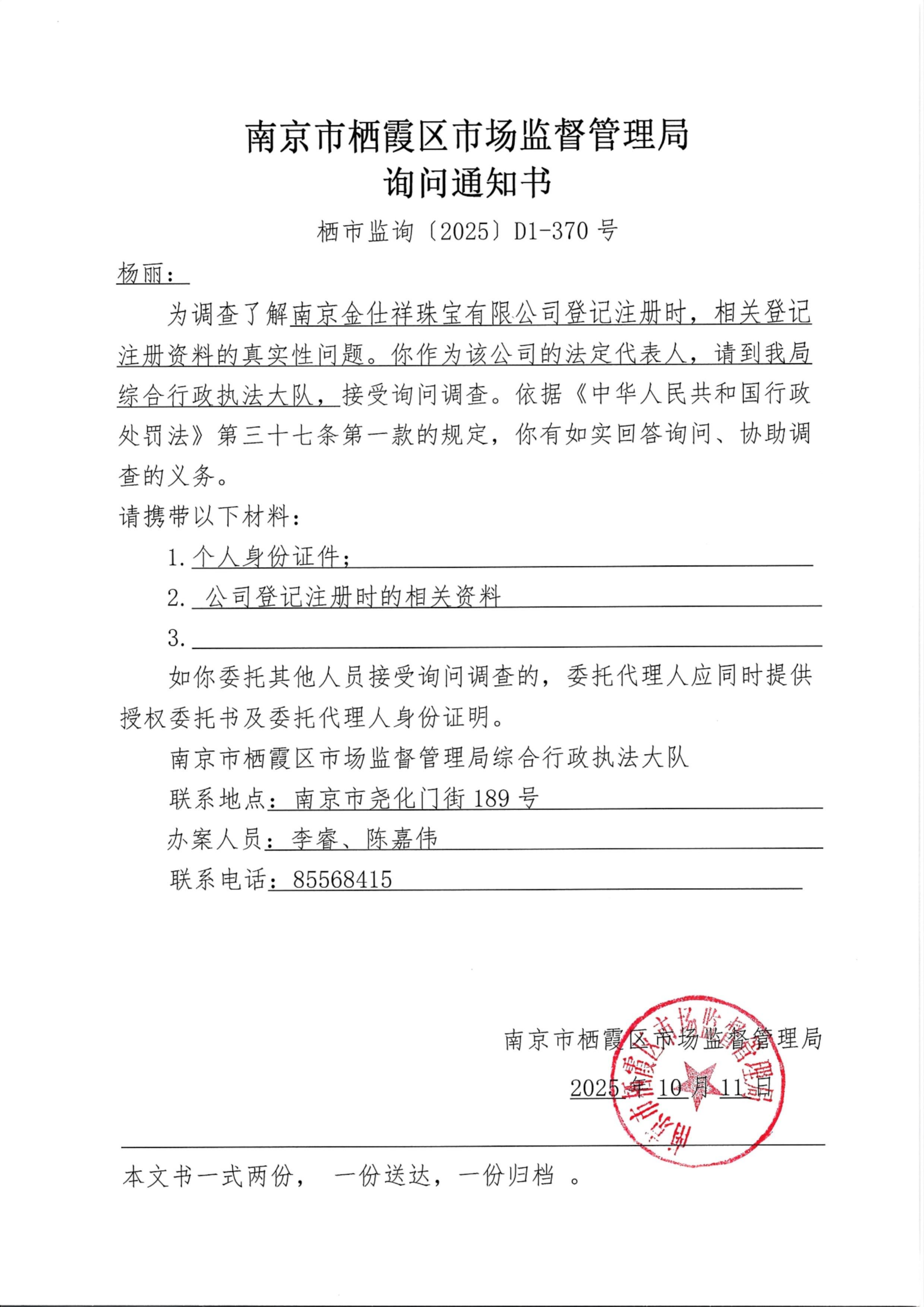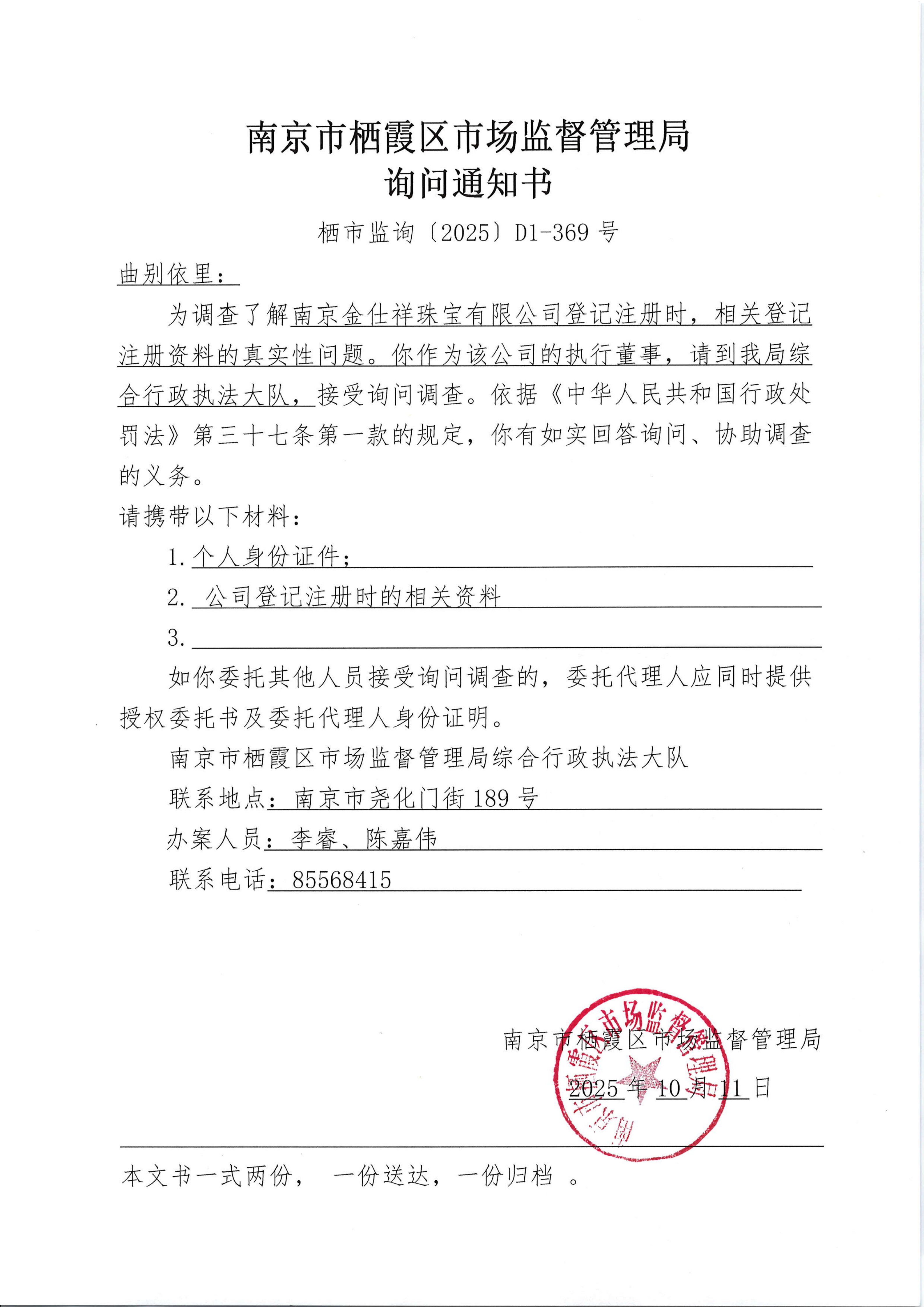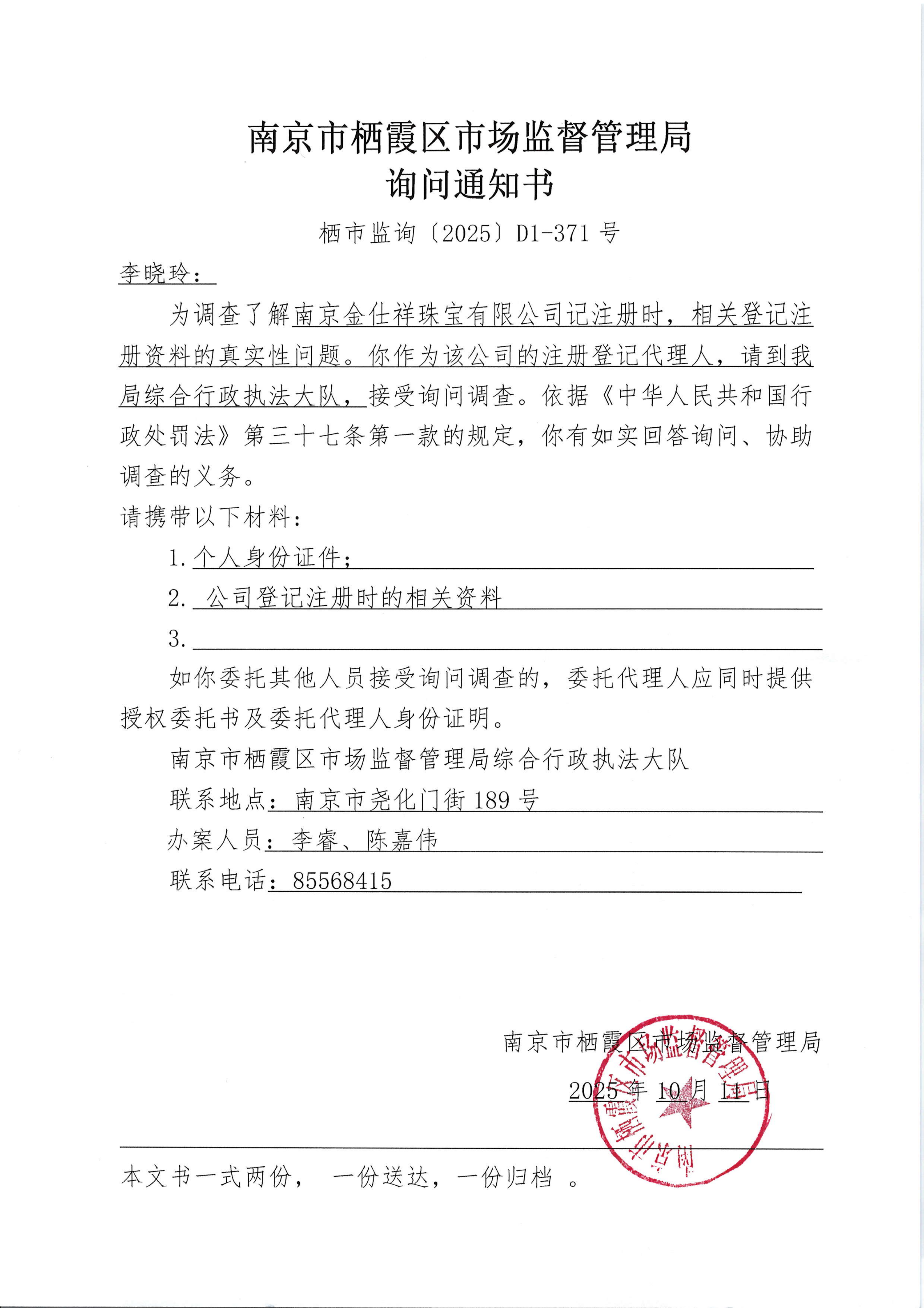 南京市棲霞區市場監督管理局詢問通知書(南京金仕祥珠寶有限公司)