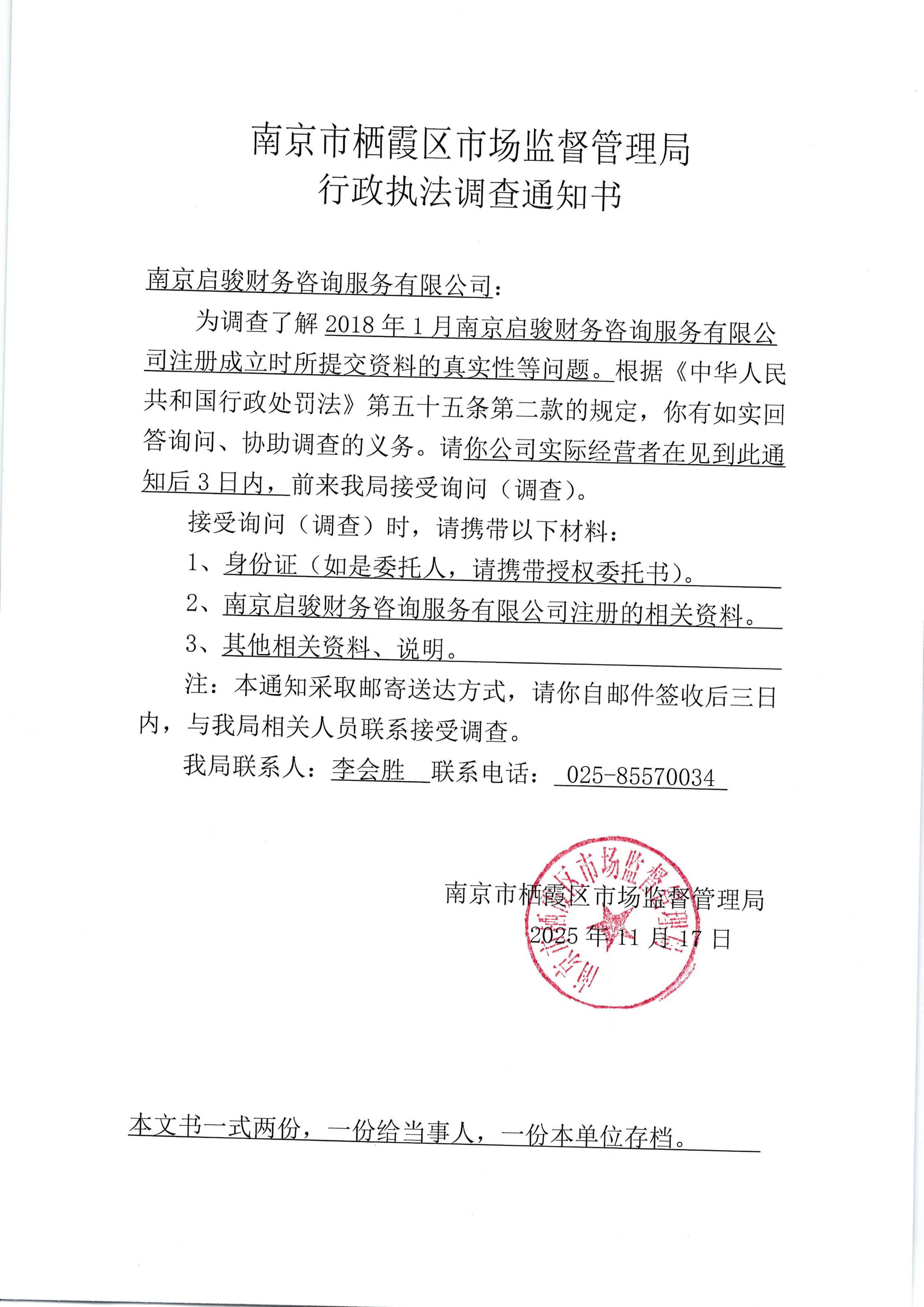 南京市棲霞區市場監督管理局行政執法調查通知書(南京啟駿財務咨詢服務有限公司)