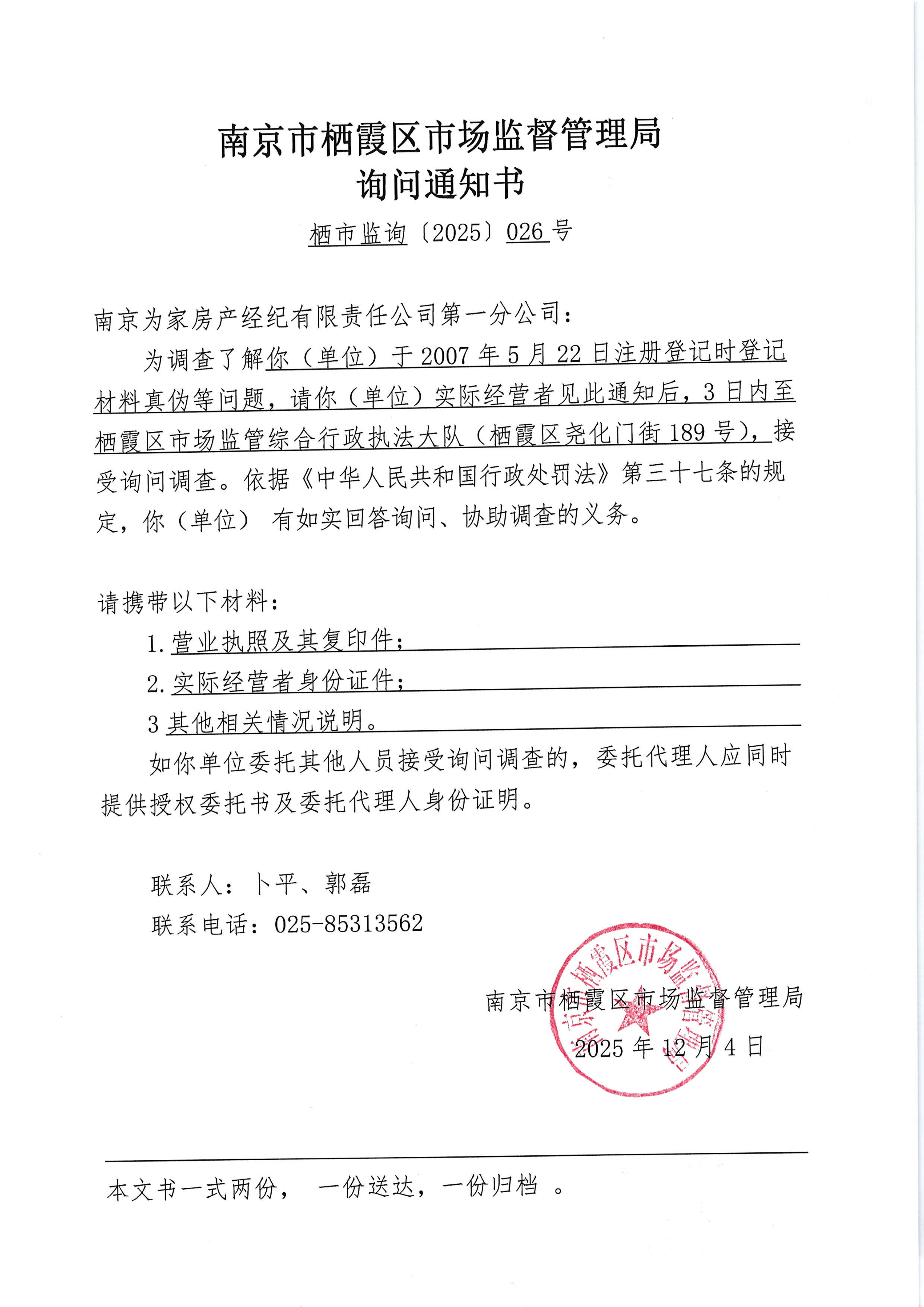 信息名稱:    南京市棲霞區市場監督管理局詢問通知書(南京為家房產經紀有限責任公司第一分公司)