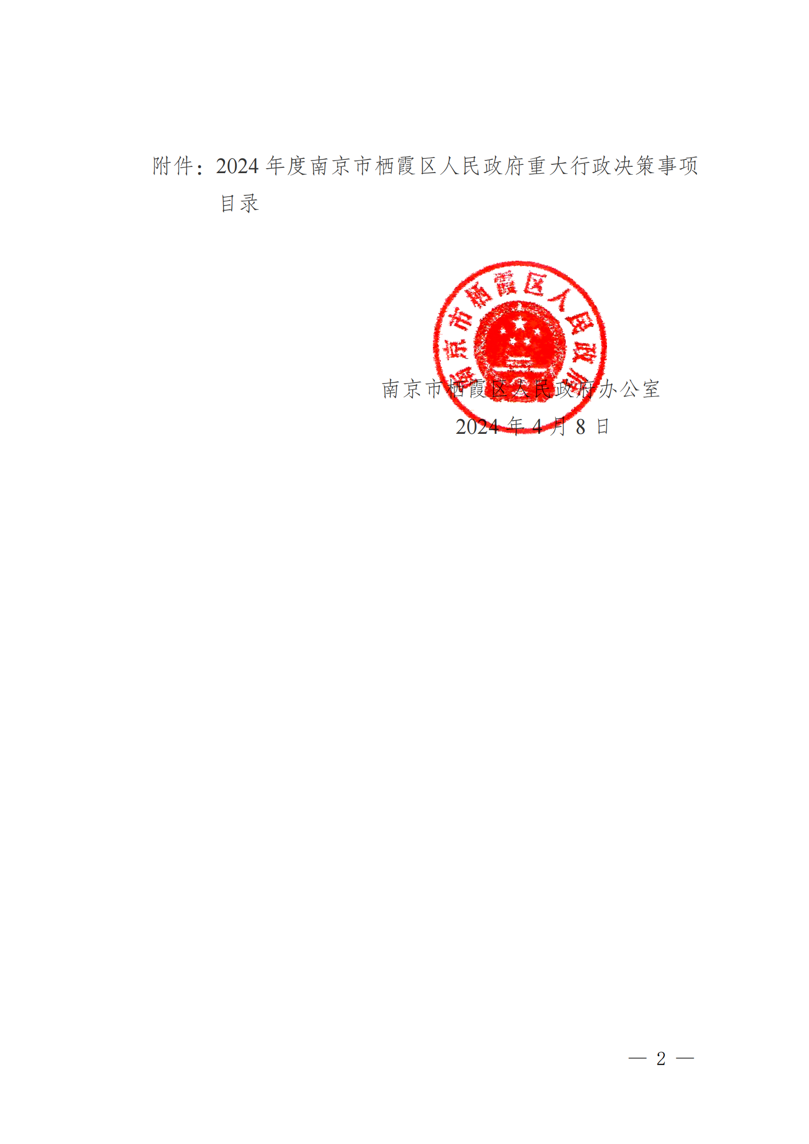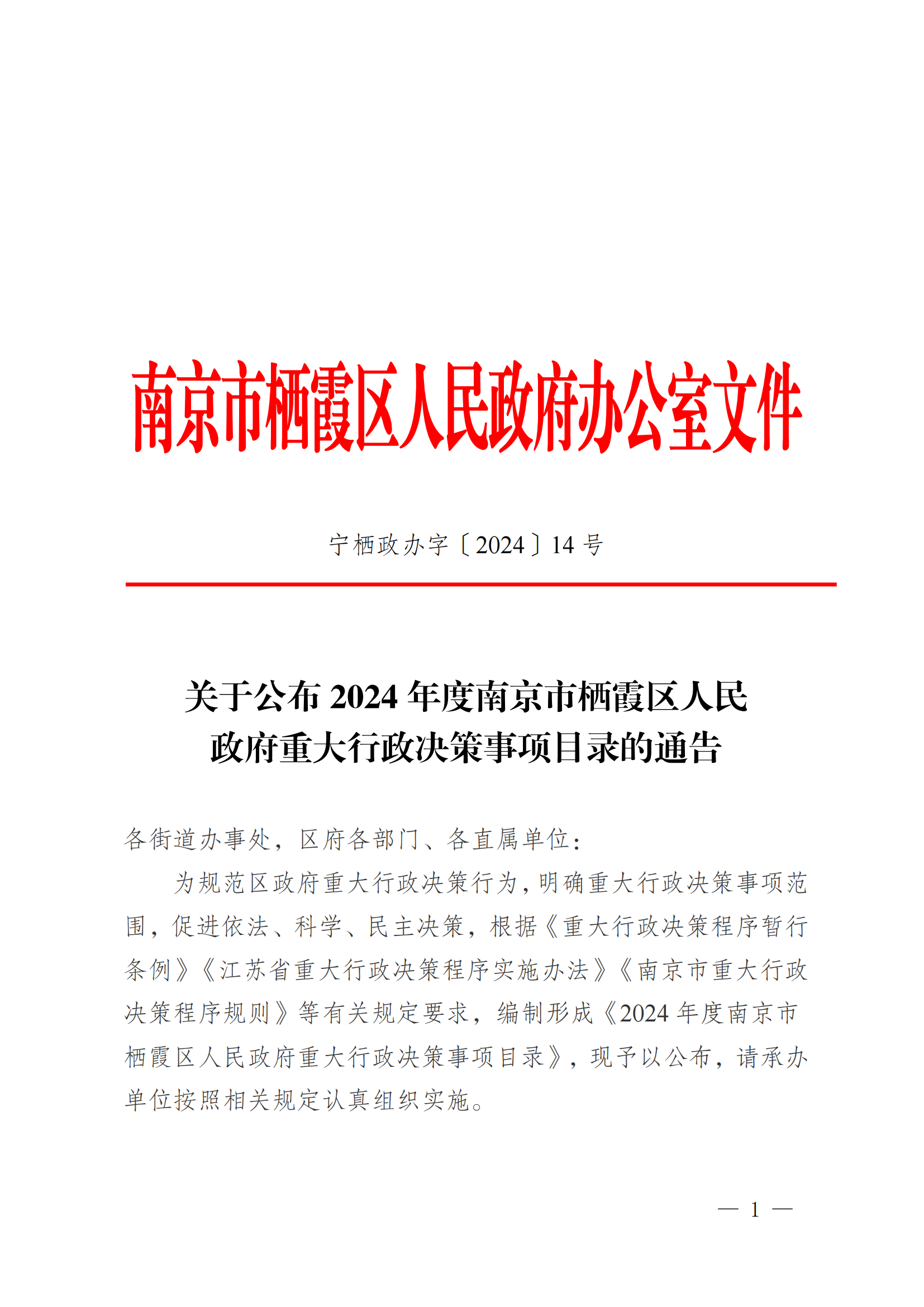 寧棲政辦字〔2024〕14號 關于公布2024年度南京市棲霞區人民政府重大行政決策事項目錄的通告
