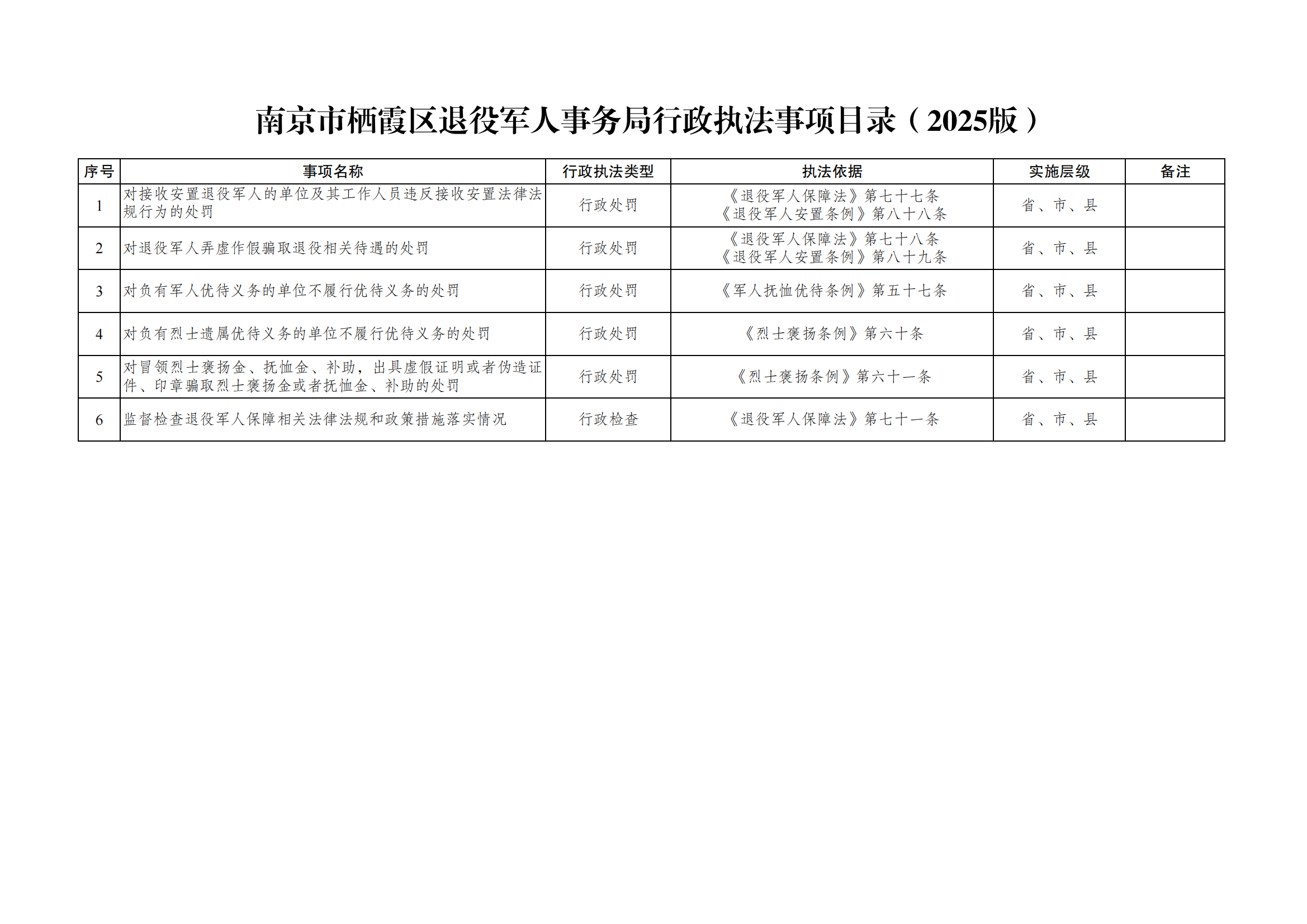 南京市棲霞區(qū)退役軍人事務局行政執(zhí)法事項目錄(2025版)