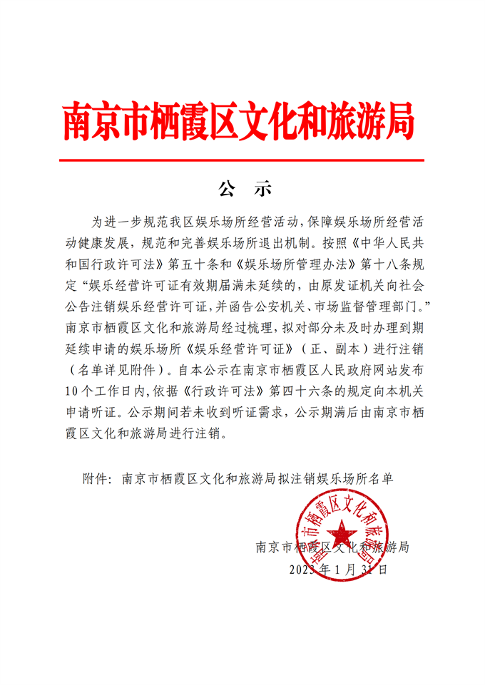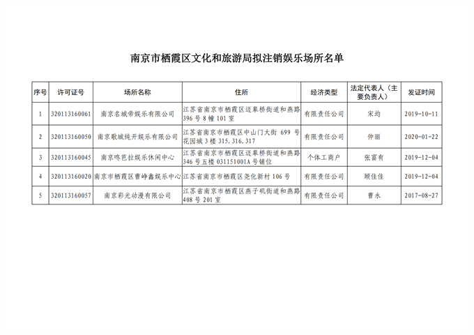 棲霞區文化和旅游局擬注銷娛樂場所名單公示