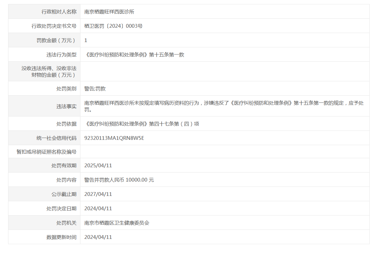 信息名稱:    醫療機構不良執業行為公示(棲衛醫罰〔2024〕0003號)