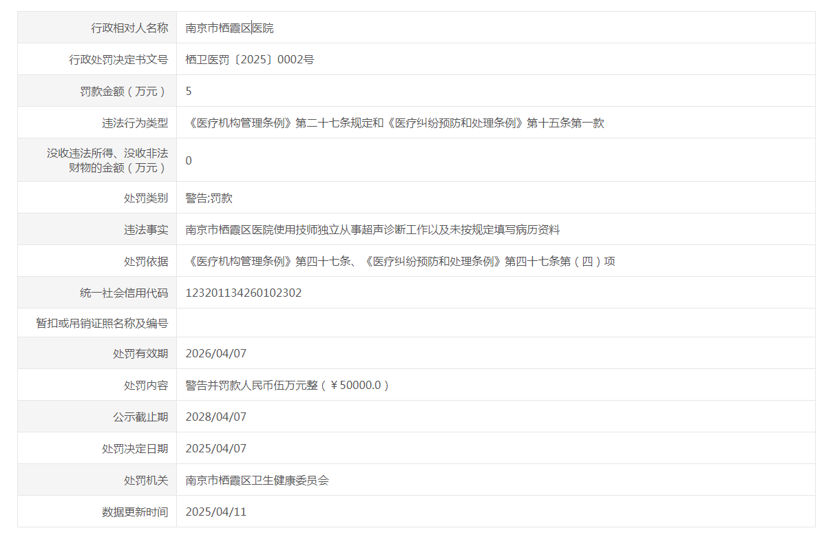 信息名稱:    醫療機構不良執業行為公示(棲衛醫罰〔2025〕0002號)