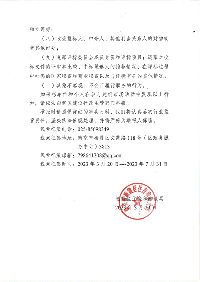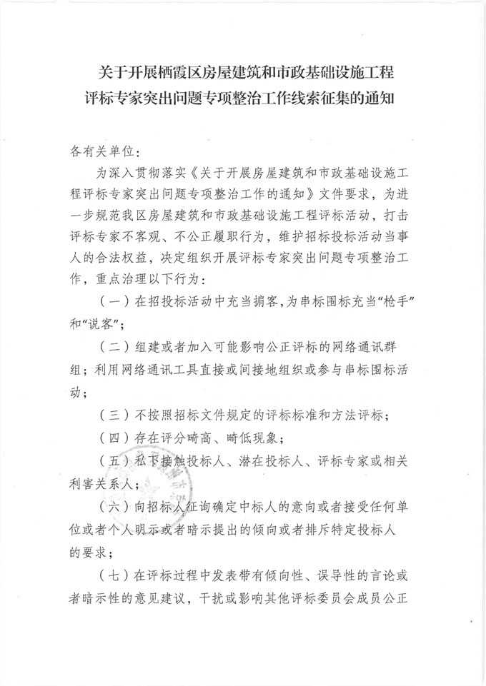 關(guān)于開展棲霞區(qū)房屋建筑和市政基礎(chǔ)設(shè)施工程評標(biāo)專家突出問題專項(xiàng)整治工作線索征集的通知