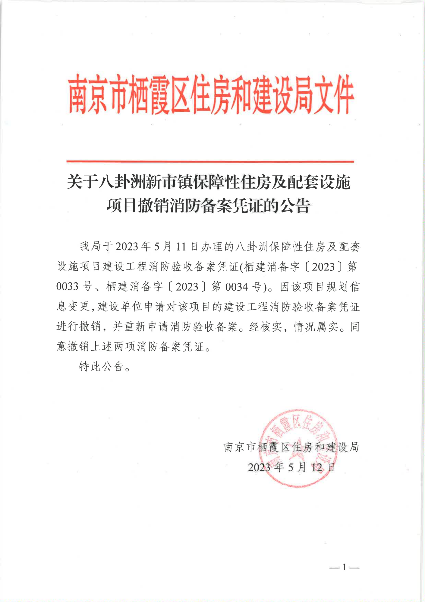關于八卦洲新市鎮保障性住房及配套設施項目撤銷消防備案憑證的公告